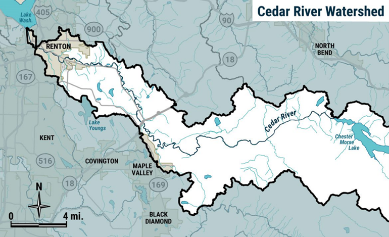 The Cedar River is within the Lake Washington watershed. A watershed is an area of land that drains rainfall and snowmelt into larger bodies of water. The Cedar River has its headwaters in the Cascade Mountains and drains rainwater into Lake Washington. The watershed has a variety of land uses, including protected forests, residential, and urban areas such as downtown Renton. Madsen, Taylor, and Rock creeks flow into the Cedar River. These creeks are minor contributors to flooding in nearby communities along the Cedar River.