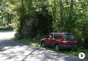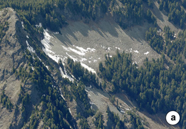 In alpine settings, cliffs are usually on the upper slopes of a mountain with a talus below that extends to the base of the mountain (see figure "a" below). A talus is a slope made from the accumulation of rock debris. Rocks and boulders that fall from the cliffs generally don’t extend past the edge of the talus, but those that do can be dangerous to humans and property (see figure "b" below).