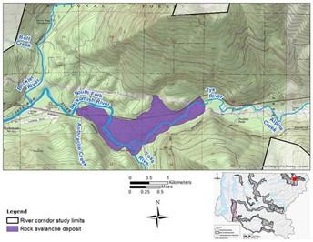 The image below is an example of a rock avalanche deposit mapped in the South Fork Skykomish River valley. Maps like this can be used to predict where a rock avalanche may occur again in the future.