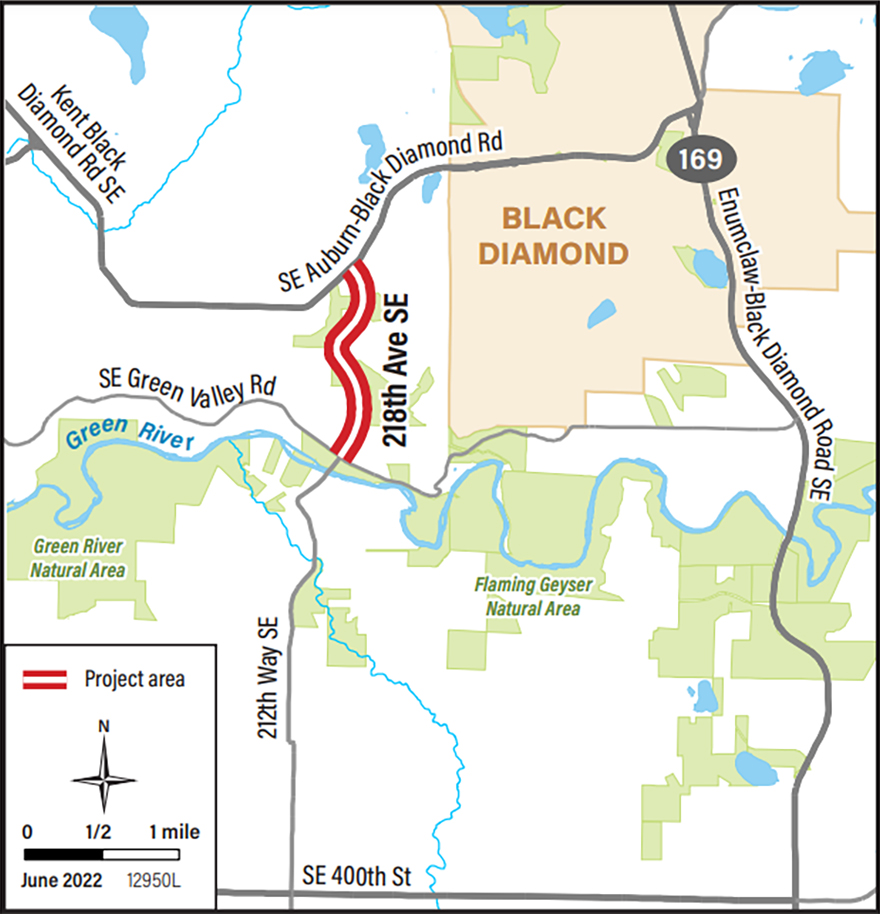 There are three travel lanes on 218th Avenue SE, two lanes northbound and one lane southbound. This project removed and replaced 1.4 miles of 218th Avenue SE from SE Green Valley Road to SE Auburn Black-Diamond Road west of Black Diamond, WA. This road is a King County lifeline and evacuation route. Many travelers also use this section of road as an alternate access route to State Route 169 (Enumclaw-Black Diamond Road SE). Over time, the pavement has been repaired and patched repeatedly. The road and the support system under the road were in poor condition and needed to be replaced. Restoration of this well-traveled road ensures its usefulness for years to come.