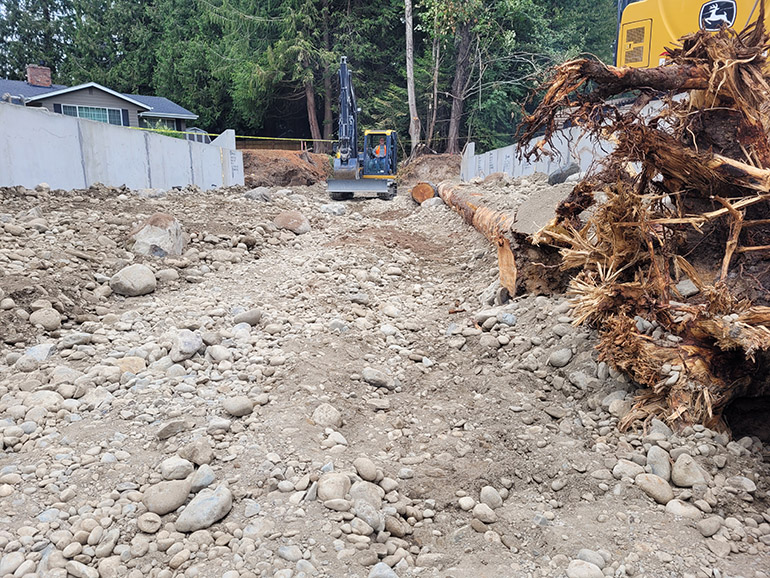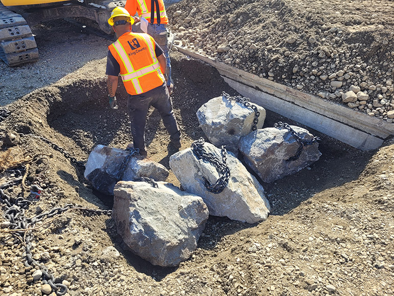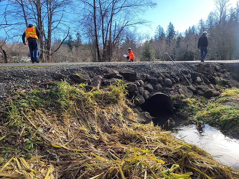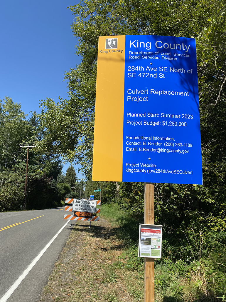King County replaced a narrow, worn-out metal pipe culvert with a much larger and wider concrete box culvert under 284th Avenue SE just north of SE 472nd Street. The old metal pipe culvert was rusted and nearing the end of its useful life. A larger concrete box culvert was installed to decrease flooding and support fish passage.