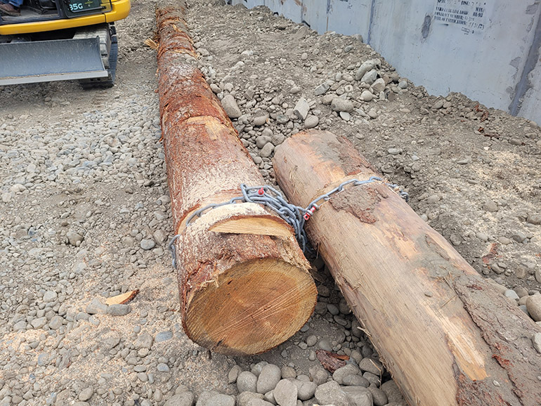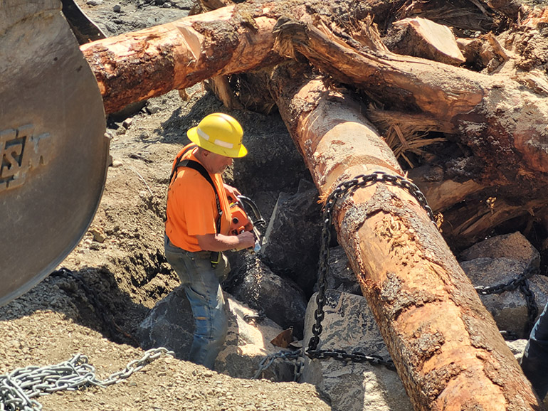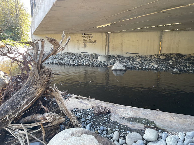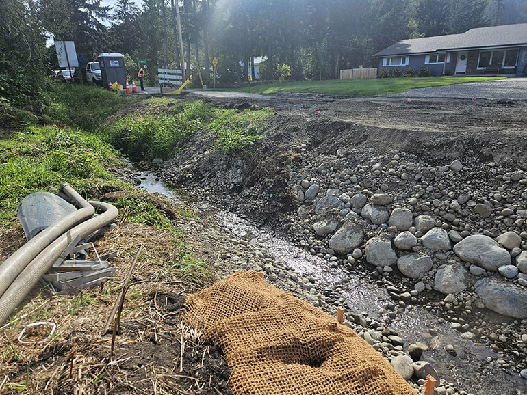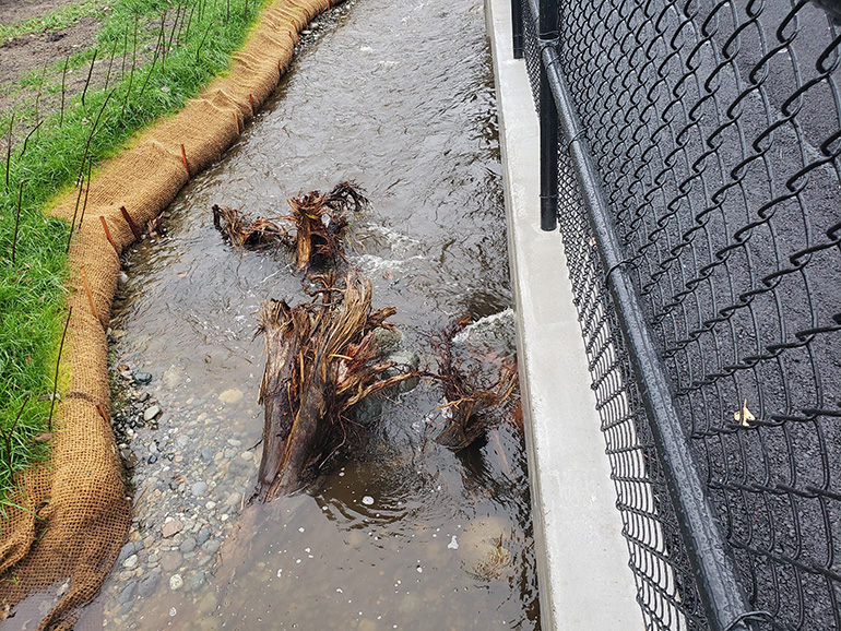November 2023 – Burlap barriers around the edges of the streambed help to prevent soil from sliding downward into the stream.