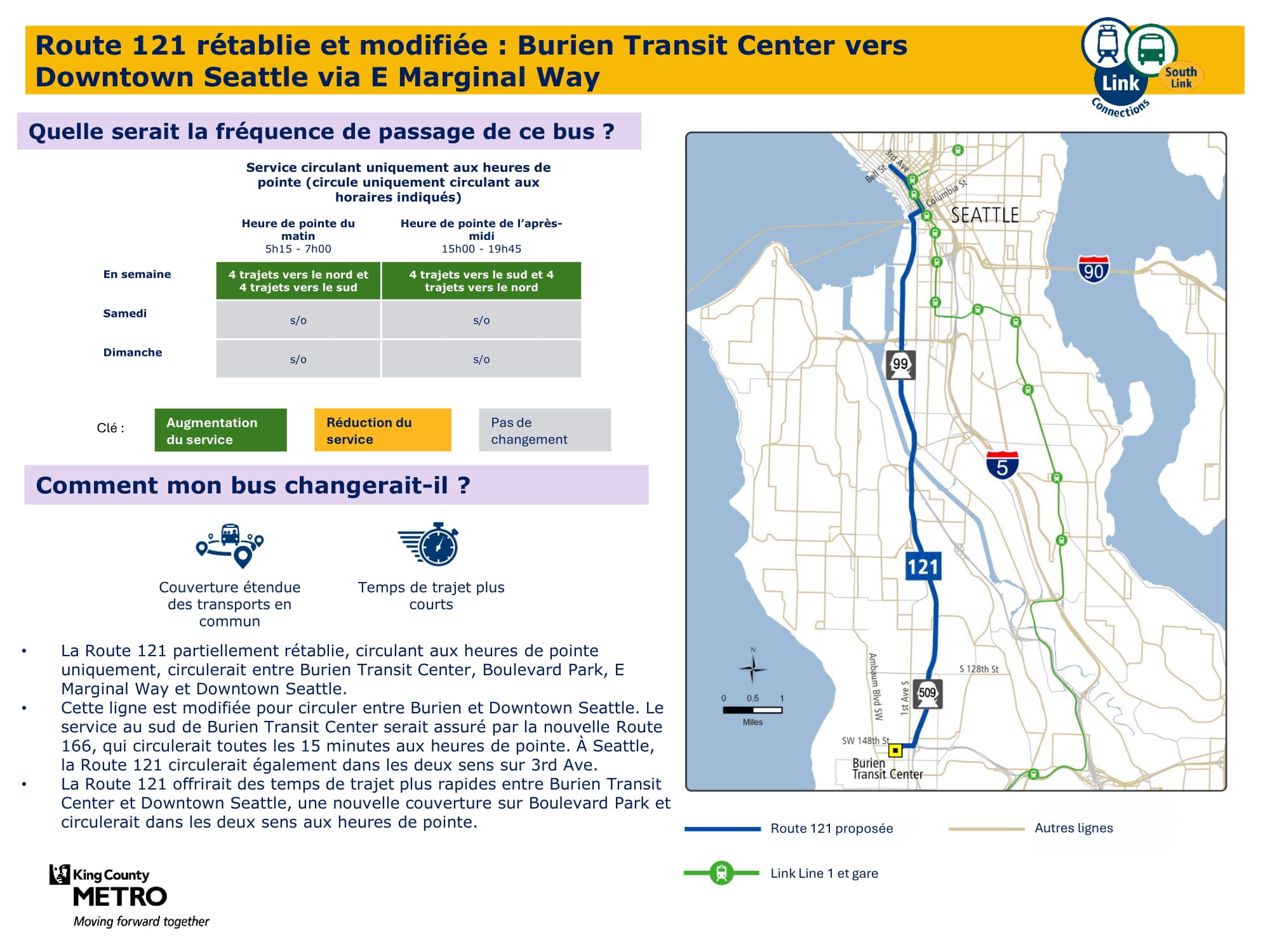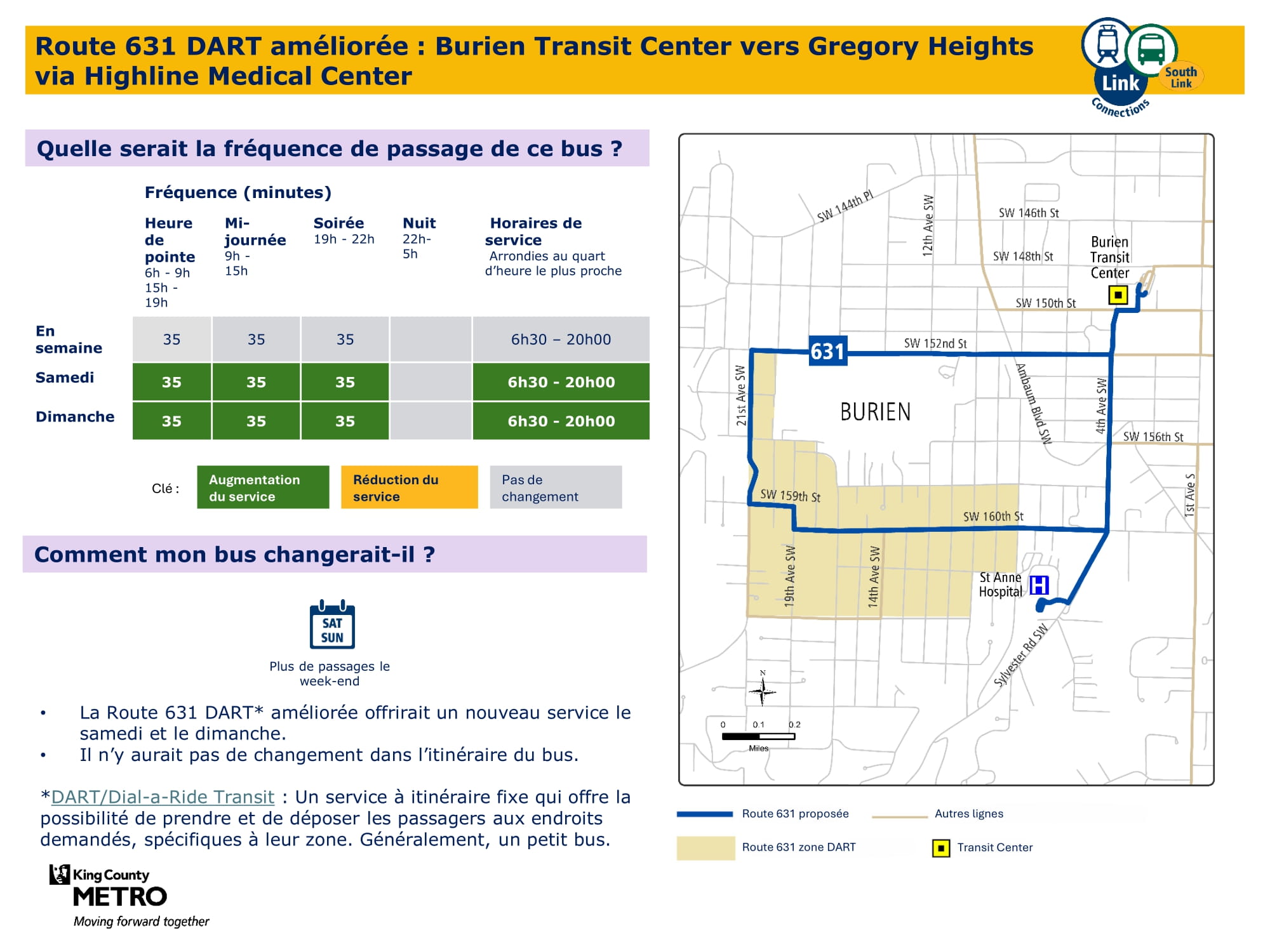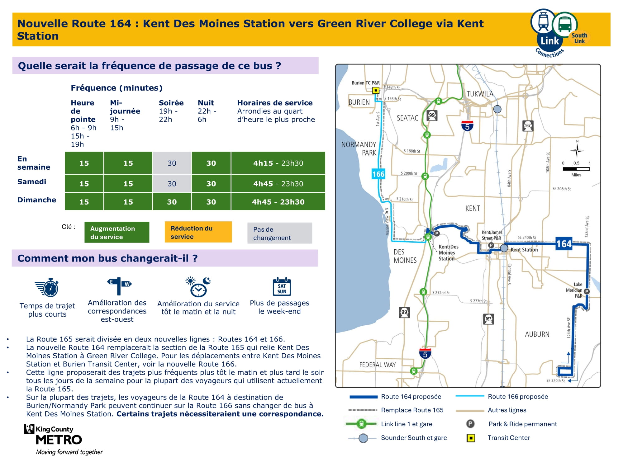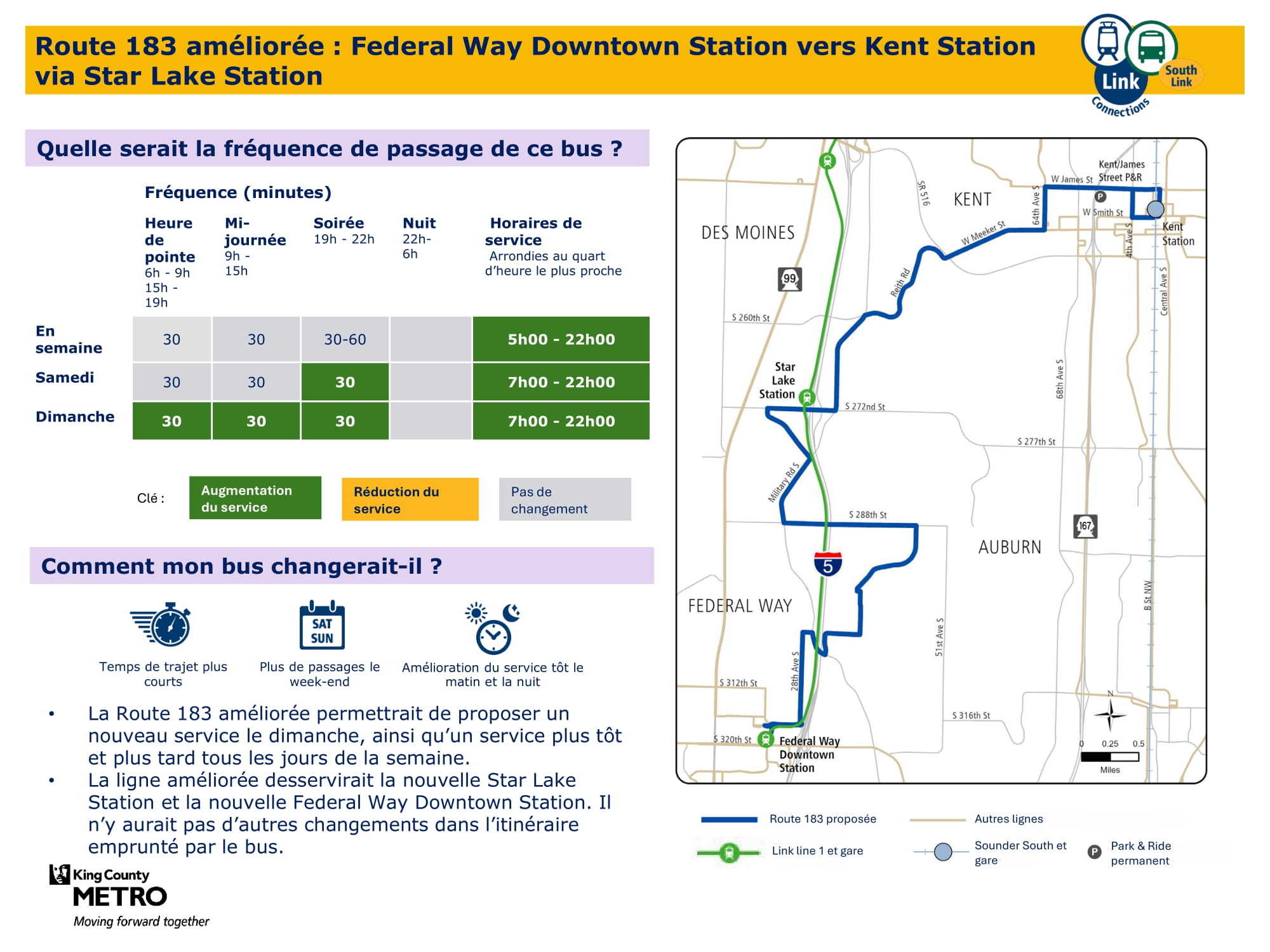 - Extension du service le week-end : Introduction de nouveaux services le samedi et le dimanche, et augmentation de la fréquence sur les axes principaux. Concrètement, le projet prévoit l’introduction d’un nouveau service le week-end à Burien, la mise en place d’un nouveau service le dimanche entre Kent et Federal Way, ainsi qu’une augmentation de la fréquence des services le week-end entre la station Kent Des Moines, la station Kent, Kent East Hill et Green River College. La proposition finale prévoit 57 % de trajets supplémentaires le samedi et presque deux fois plus de trajets le dimanche par rapport à aujourd’hui.