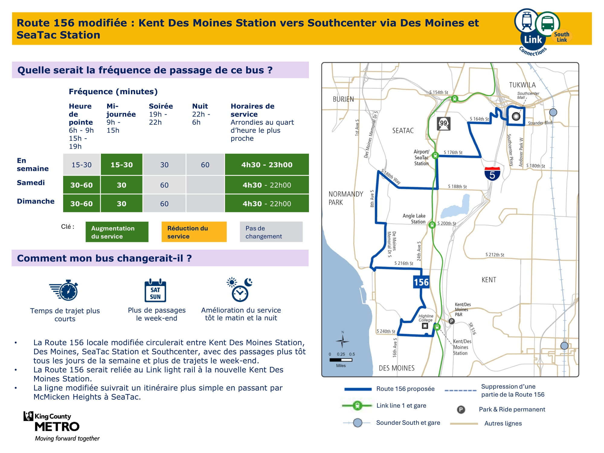 Amélioration avec plus de voyages tous les jours de la semaine. Connexion avec le train léger Link à la station Kent Des Moines et aura une ligne plus directe à travers McMicken Heights. |