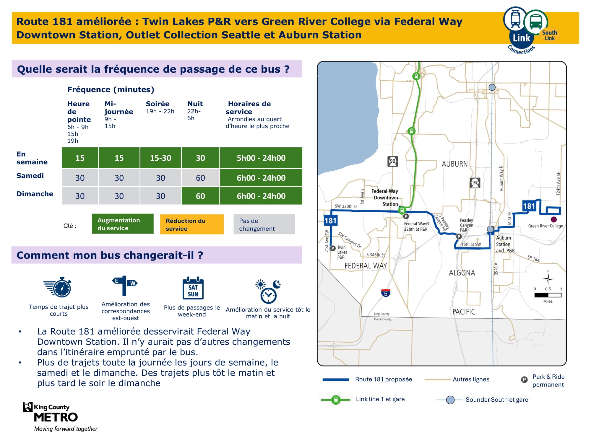Amélioration avec un nouveau service le dimanche et plus de trajets en semaine et le samedi. Sera relié au train léger Link aux stations Federal Way Downtown et Star Lake. |