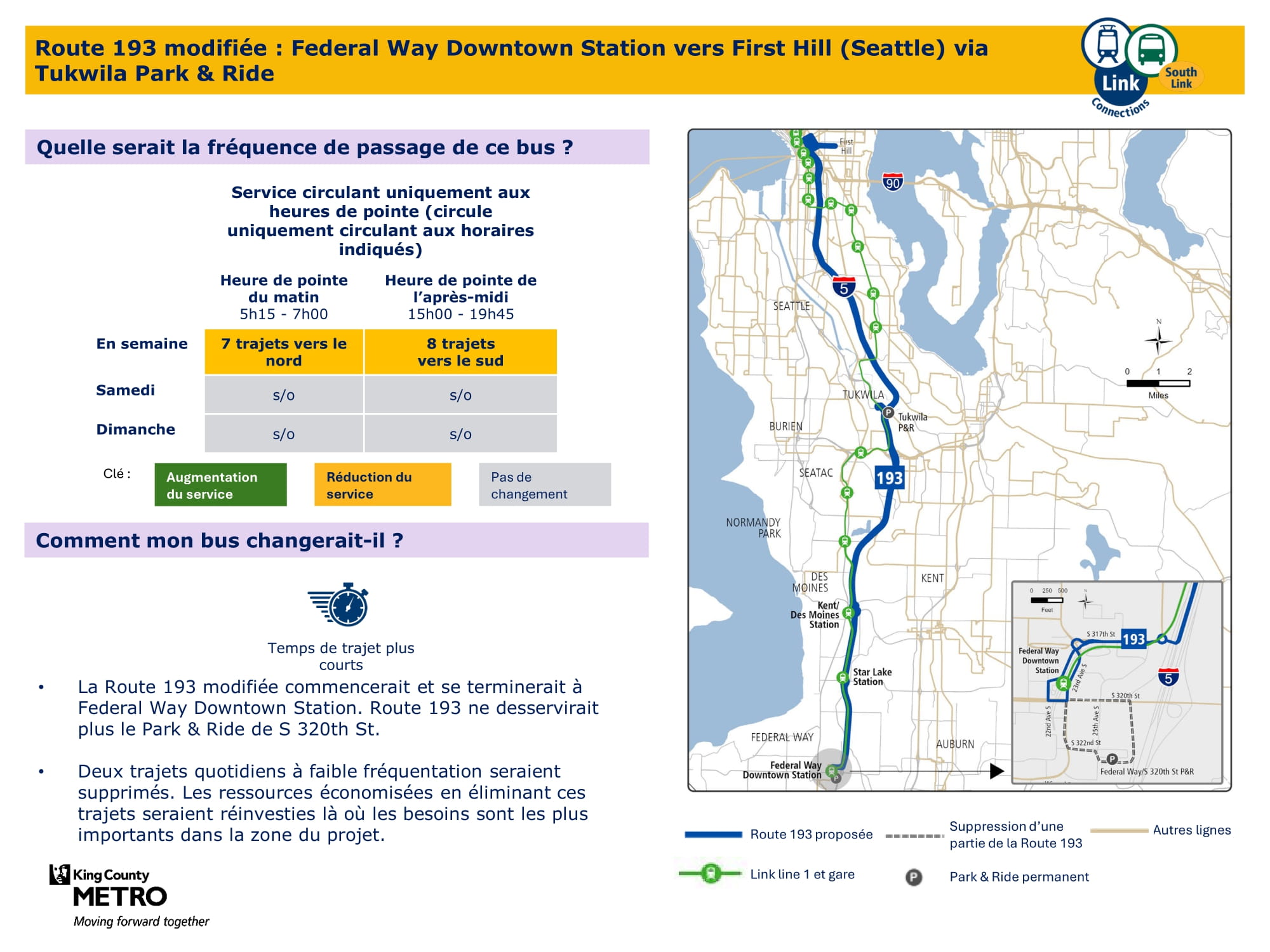 - Service plus rapide : Mise à jour des lignes de bus entre Federal Way et le centre-ville de Federal Way afin de rendre les trajets plus rapides, plus directs et plus faciles à comprendre.