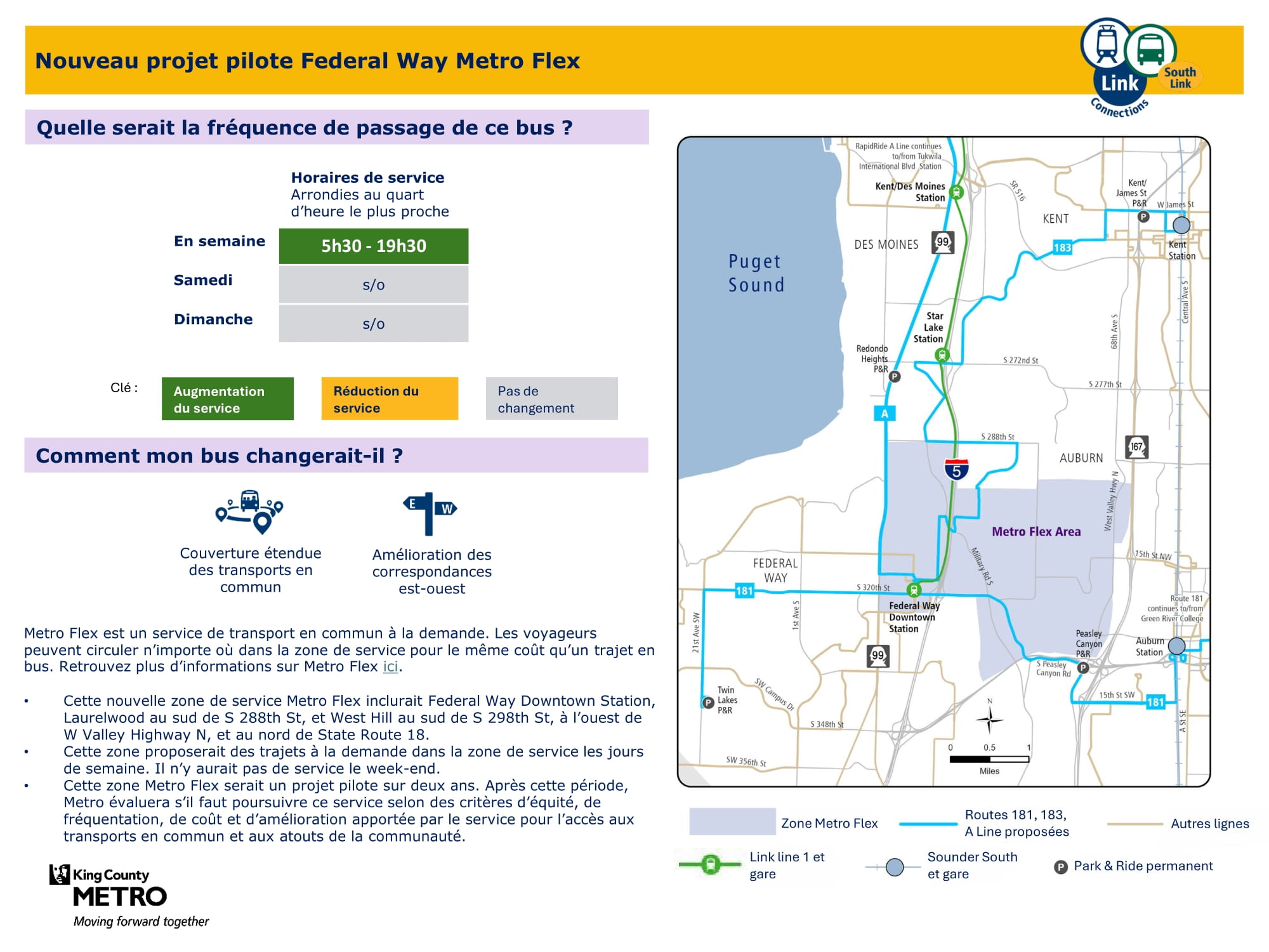 | Pilote Metro Flex Federal Way Dessert Federal Way, Auburn | Nouvelle zone pilote Metro Flex offrant un service à la demande du lundi au vendredi. Desservant la station Federal Way Downtown, Laurelwood au sud de S 288th St et West Hill au sud de S 298th St, à l'ouest de W Valley Highway N, et au nord de la ligne nationale 18. |