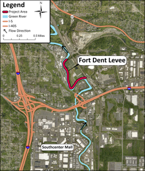 The Fort Dent Levee is located in the City of Tukwila on the right bank of the Green River when looking downstream. This levee reduces erosion and flood risks to the Green River Trail, Fort Dent Park, and Starfire Sports.