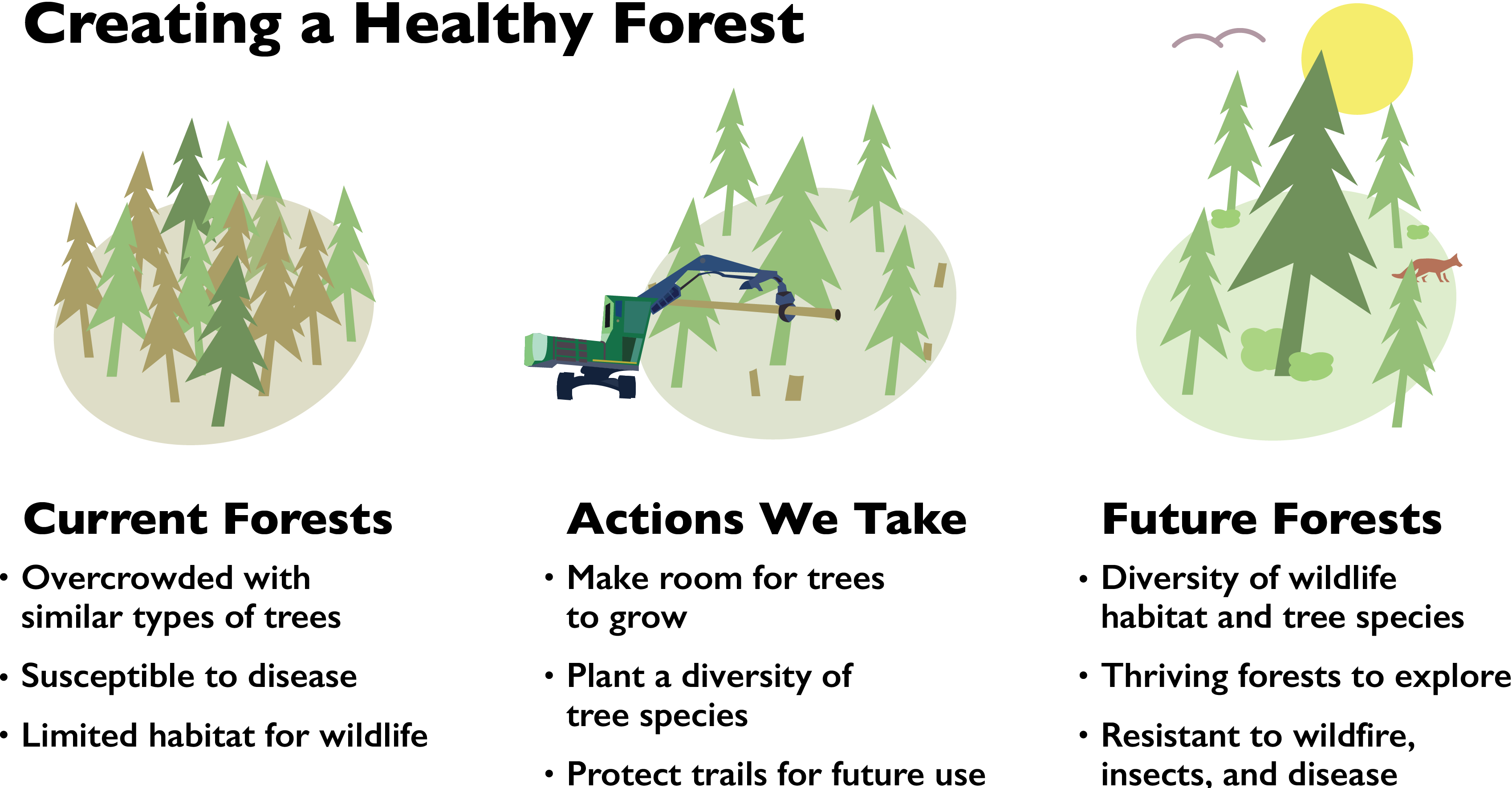 Ensuring Forest Health: In some cases, King County will conduct forest management activities that mimic natural events like fires and wind storms. These actions, such as thinning, vary the density and spacing of trees and promote diverse species and ages.