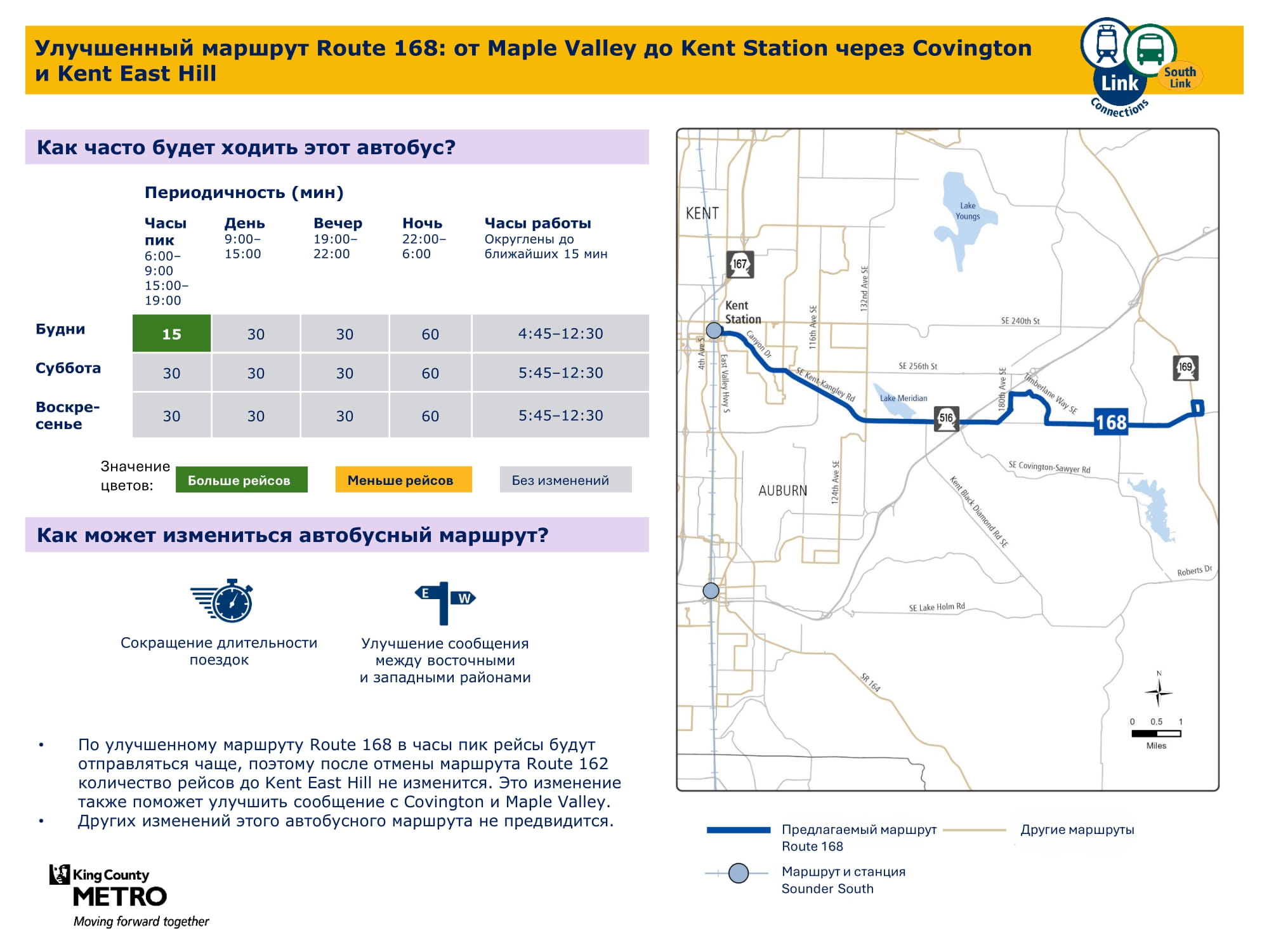 | 168 Обслуживает города Kent, Covington и Maple Valley. |