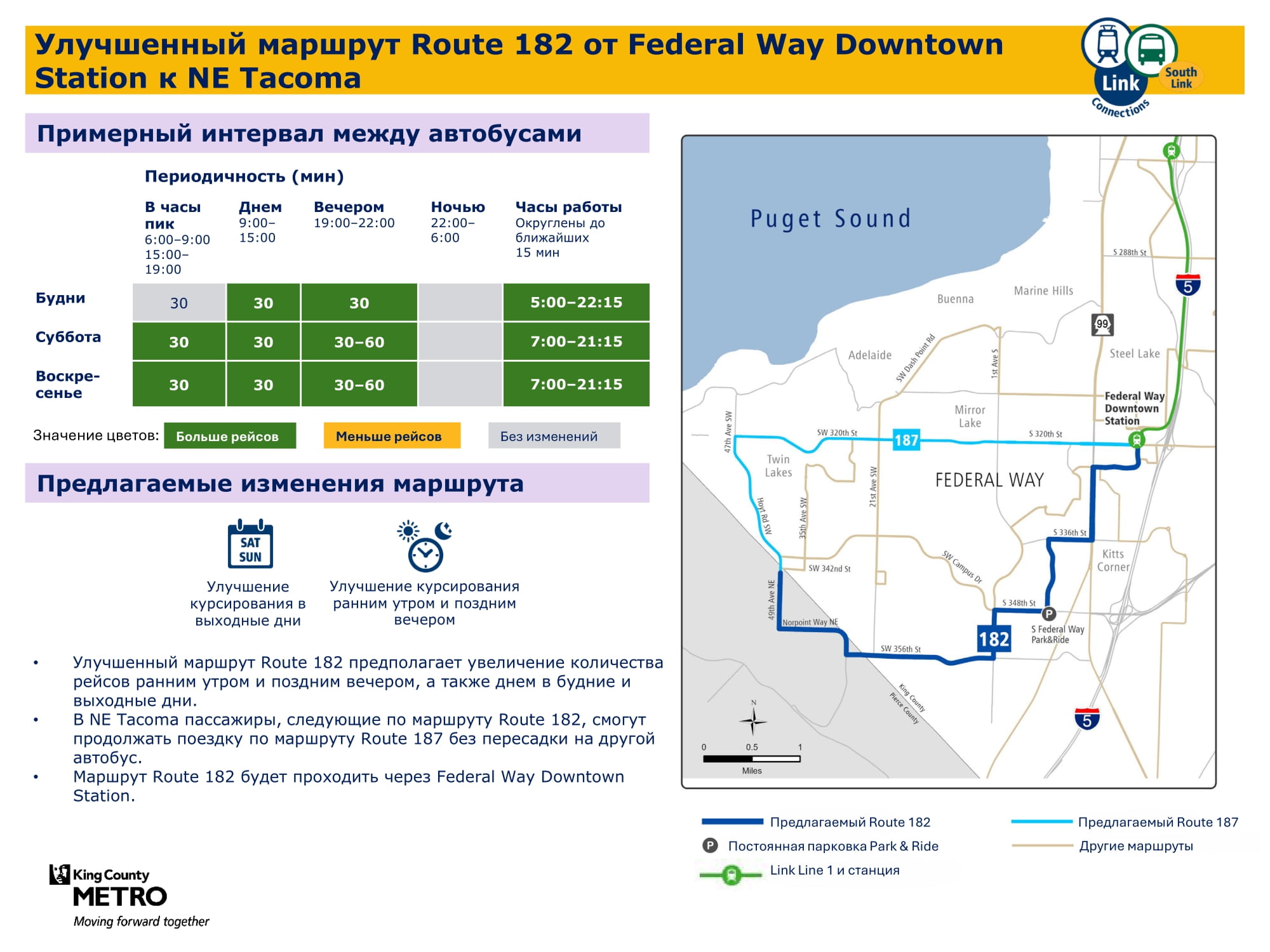 В связи с расширением сети легкорельсового транспорта Link на юг и добавлением новых трех станций в городах Kent / Des Moines, районе Star Lake и центре города Federal Way целью проекта South Link Connections является улучшение возможностей передвижения общественным транспортом для жителей сообществ в южной части округа Кинг. Сотрудничая с транспортным управлением Sound Transit (Откроется в новой вкладке) и другими партнерами, транспортная компания Metro создала новую сеть общественного транспорта, учитывая отзывы сообщества.