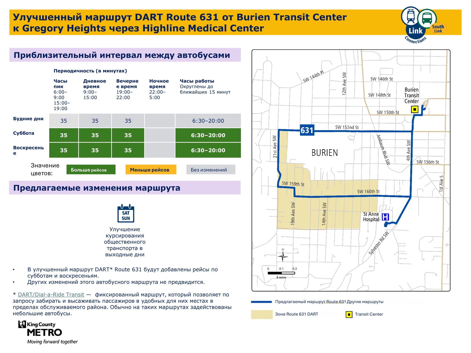 - Расширенное обслуживание в выходные дни. Введение новых маршрутов по субботам и воскресеньям, а также увеличение частоты движения общественного транспорта по выходным на основных маршрутах. В частности, будут введены новые маршруты по выходным в городе Burien, новый маршрут по воскресеньям, соединяющий Kent и Federal Way, а также более частое движение в выходные дни для маршрутов, соединяющих станции Kent Des Moines, Kent, Kent East Hill и колледж Green River College. В окончательном варианте предложения по обновлению сети общественного транспорта предусмотрено увеличение количества рейсов в субботу на 57 % и почти вдвое в воскресенье по сравнению с текущим расписанием.