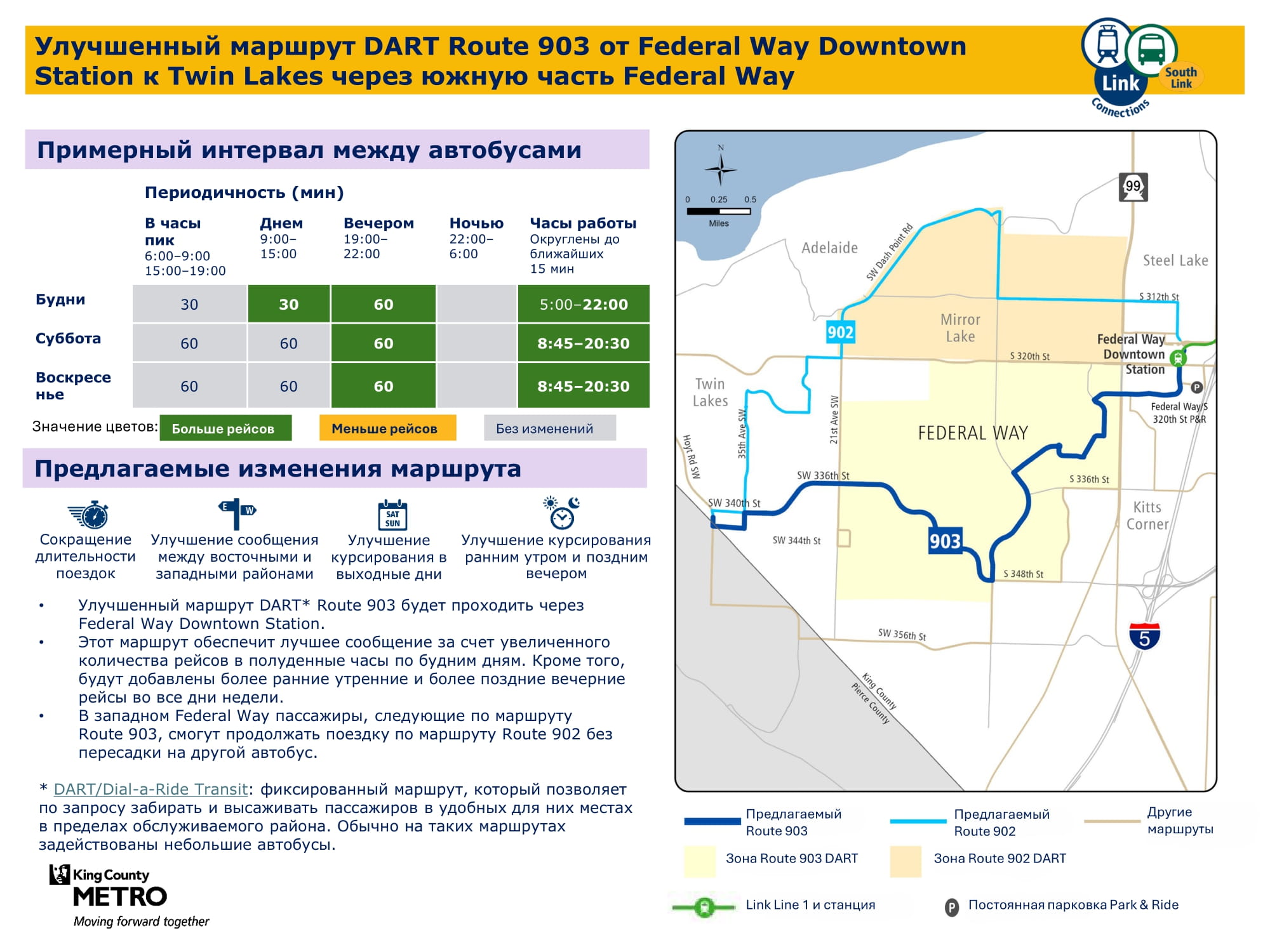 От станции Federal Way Downtown до South Federal Way Новый маршрут DART. Частично заменит маршрут DART 901. Кроме того, будет увеличено количество рейсов на протяжении всей недели. Он будет обеспечивать пересадку на легкорельсовый трамвай Link на станции Federal Way Downtown. |