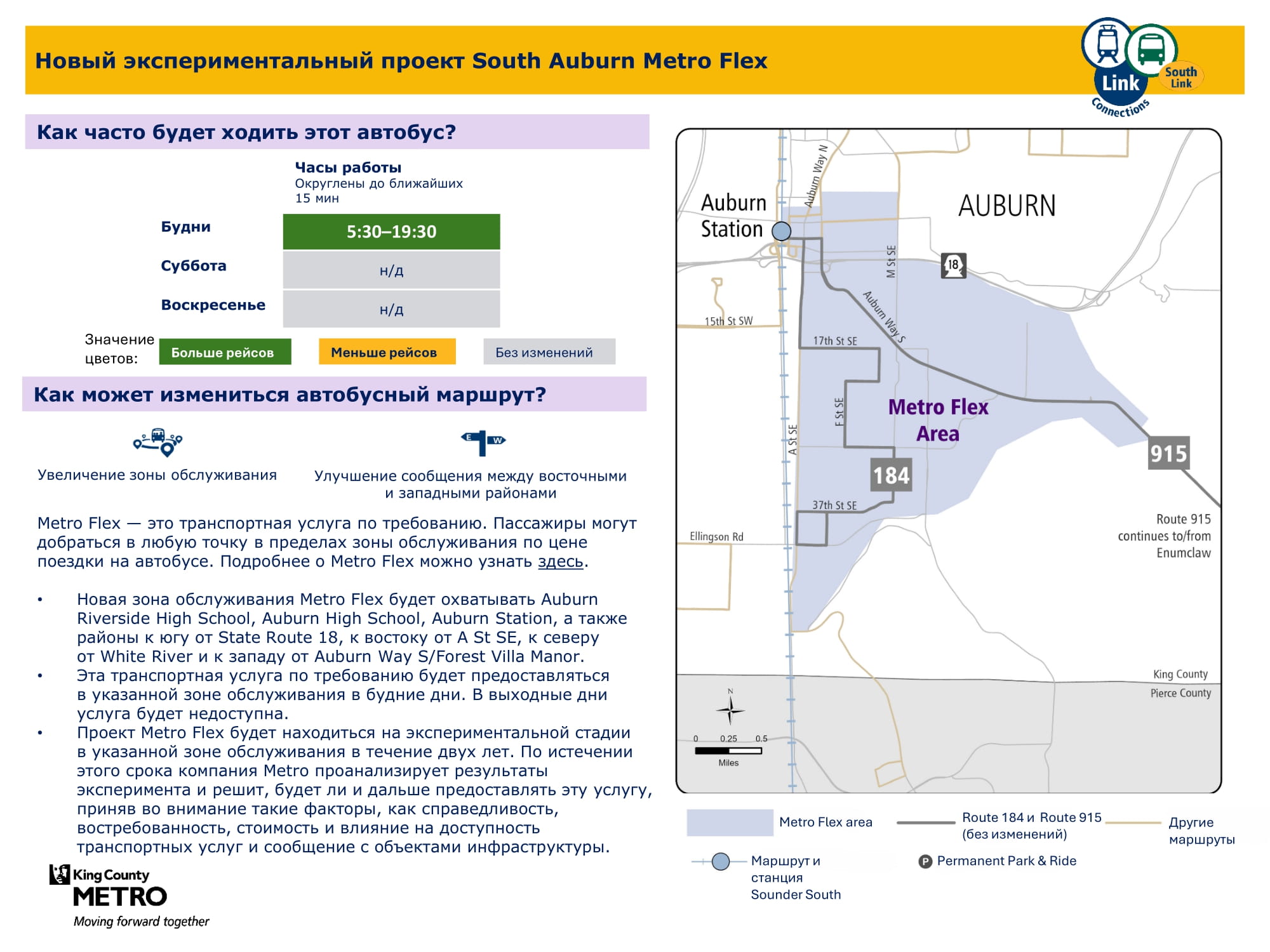 | Экспериментальный проект South Auburn Metro Flex Обслуживает Auburn | Новая зона экспериментальной работы службы транспорта по запросу Metro Flex, предлагающая обслуживание с понедельника по пятницу. Зона обслуживания охватывает территорию южнее автомагистрали State Route 18, восточнее A Street SE, севернее White River и западнее Auburn Way S/Forest Villa Manor. Эта зона также включает станцию Auburn и школу Riverside High School. |