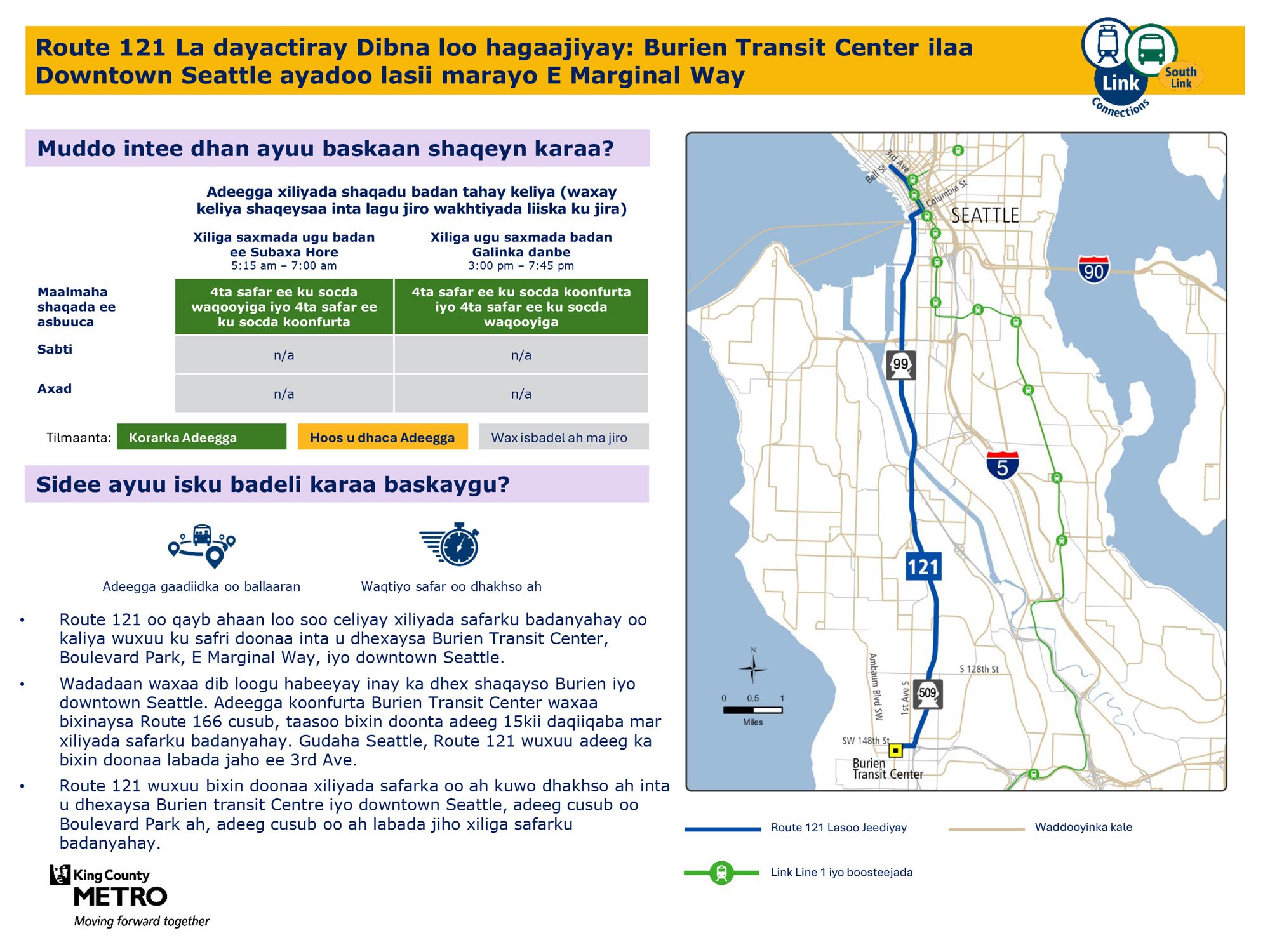 121 Waxay u adeegtaa Burien, magaalada hoose Seattle Burien Xarunta gaadiidka dadweynaha ee magaalada hoose Seattle iyada oo loo marayo E Marginal Way.