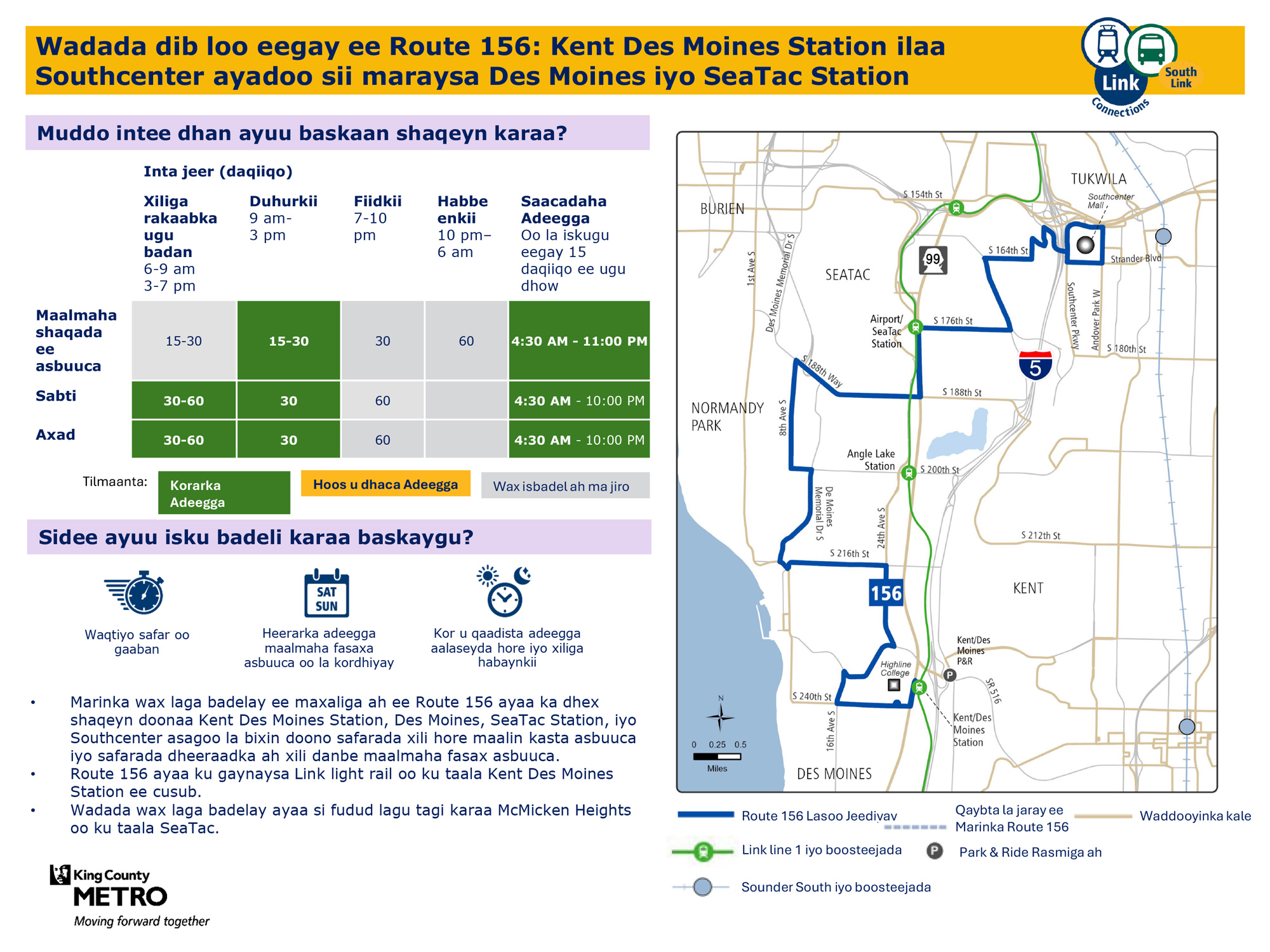 156 Waxay u adeegtaa Kent, Des Moines, SeaTac, Tukwila Kent Des Moines Station ilaa Southcenter ayadoo sii maraysa Des Moines iyo SeaTac Station.