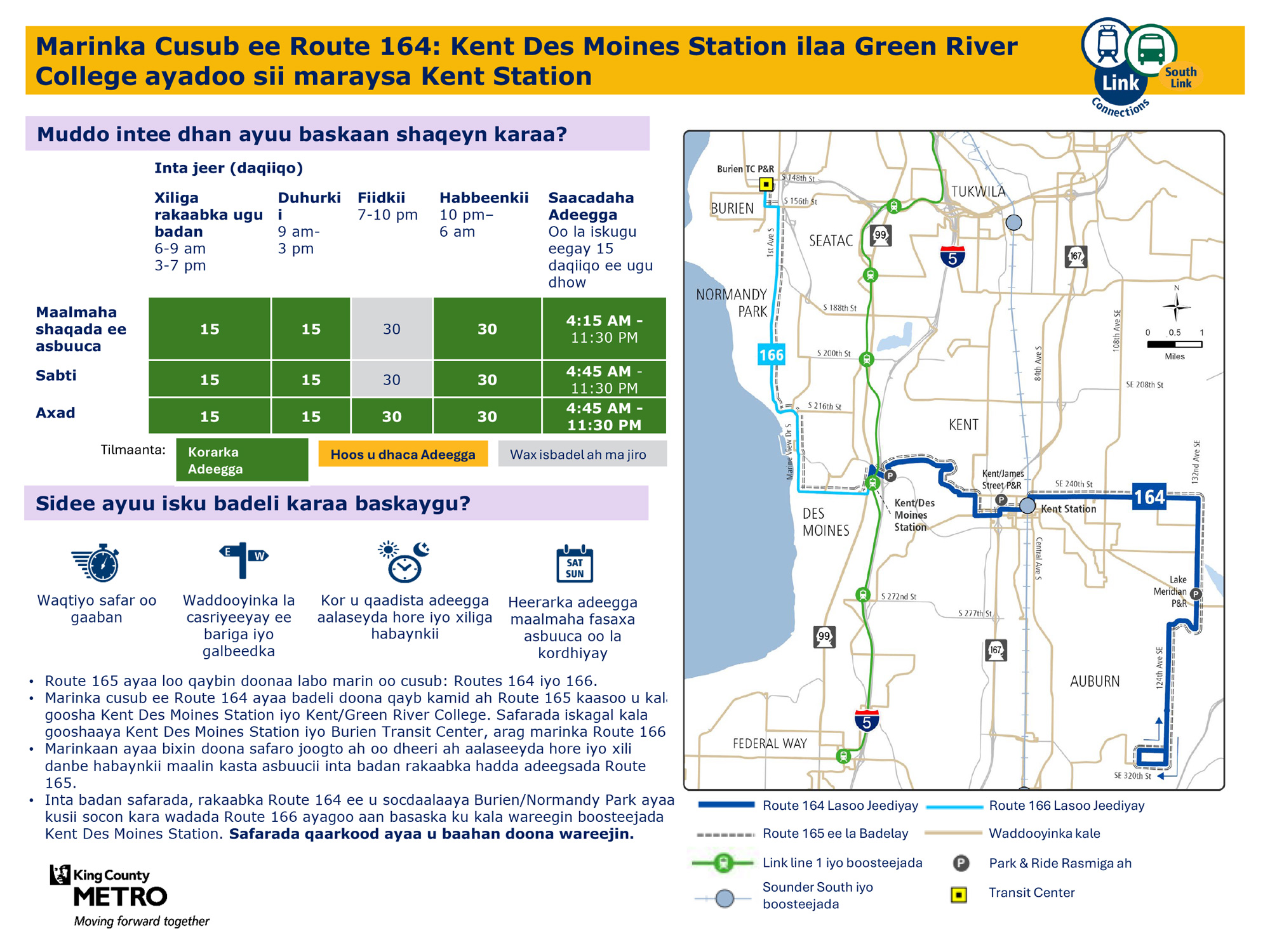 Waddo cusub oo soo noqnoqda oo leh safarro badan maalin kasta oo toddobaadka ah. Waxay badalaysaa qayb kamid ah Wadada 165. Waxay kaga xirtaa tareenka fudud ee tareenka fudud ee LinkKent Des Moines Station. Dhamaan safaradu waxay noqon doonaan Wadada 164 safarada rakaabka u safraya goobo ka baxsan Kent Des Moines Saldhiga.