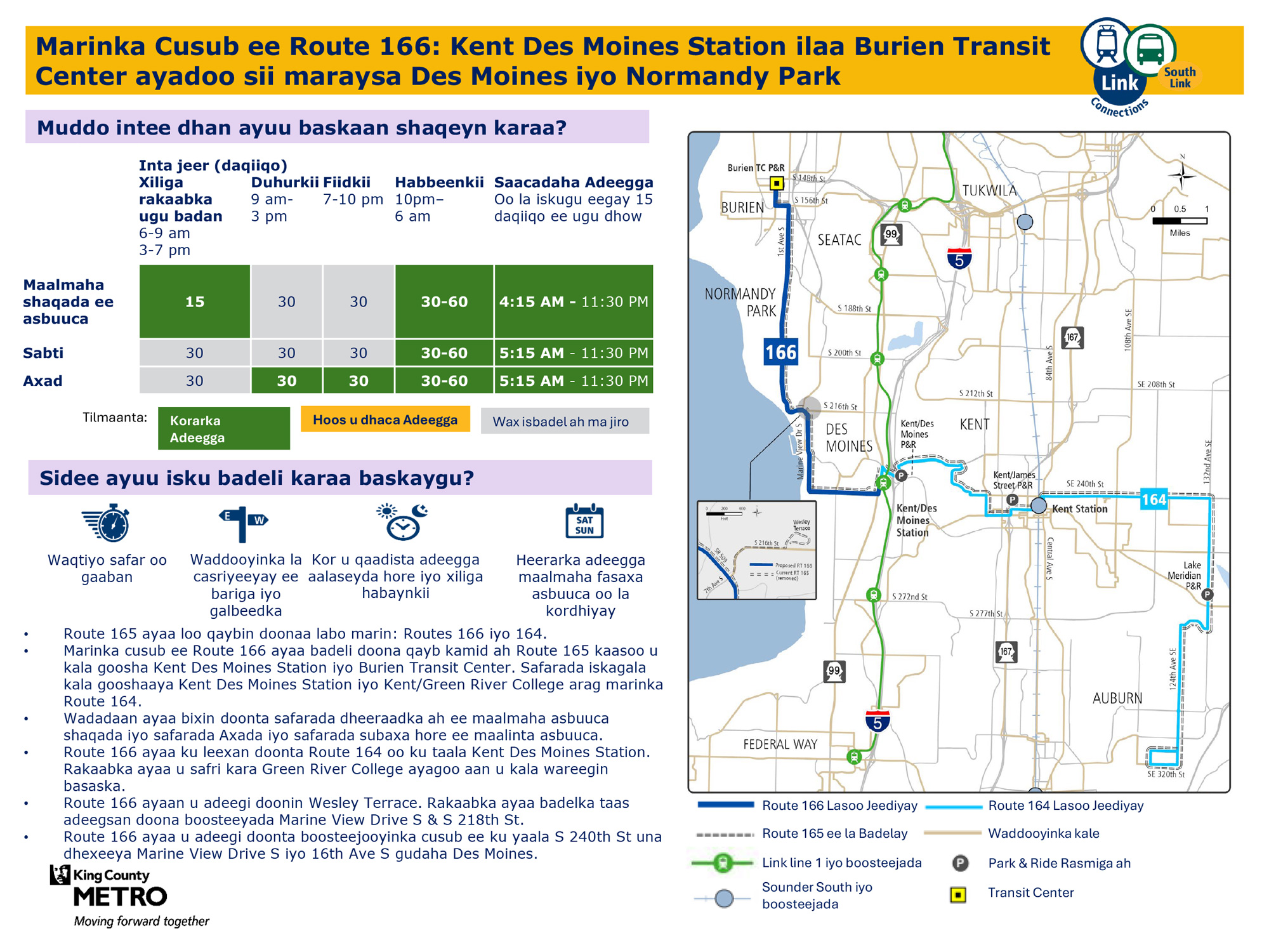 Wado cusub oo joogto ah oo leh safaro badan maalin kasta todobaadka. Waxay badalaysaa qayb kamid ah Wadada 165. Waxay kaga xirtaa tareenka fudud ee Link barta Kent Des Moines Station. Safarada qaar waxay noqonayaan Wadada 166 safarada rakaabka u socdaalaya goobo ka baxsan Kent Des Moines Station.