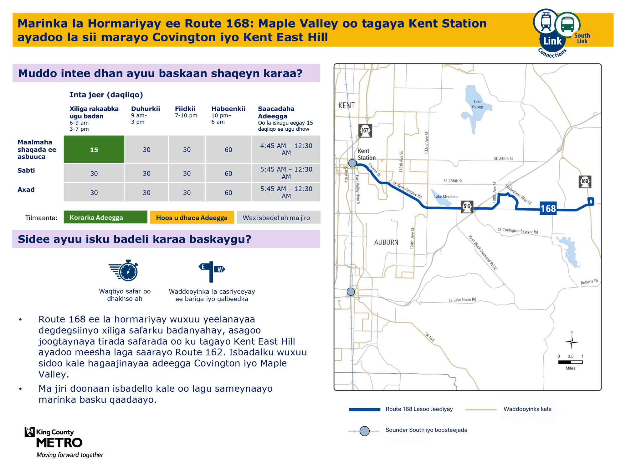 168 Waxay u adeegtaa Kent, Covington, Maple Valley Kent Saldhiga ilaa Maple Valley la marayo Covington iyo Kent East Hill.