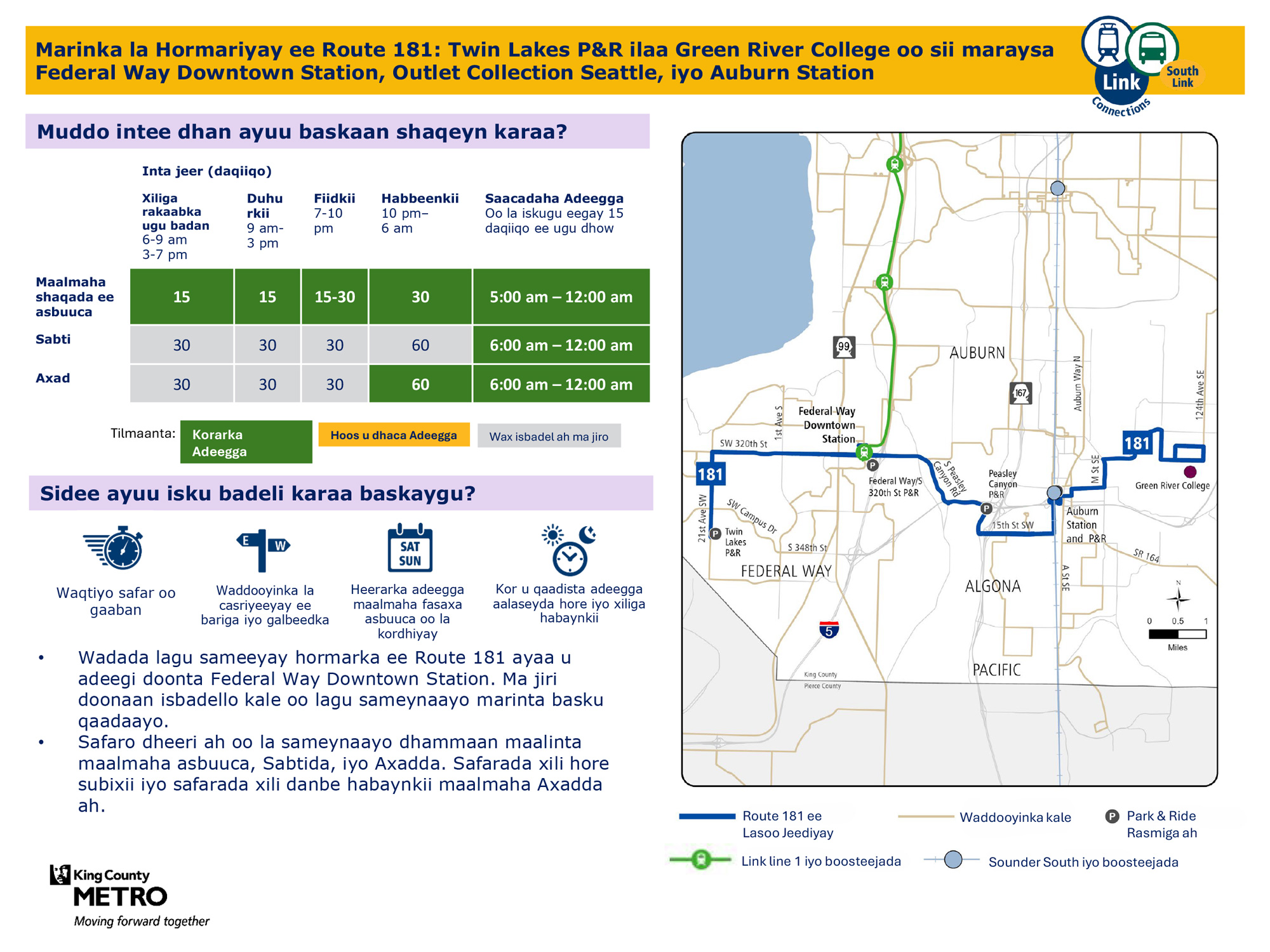 181 Waxay u adeegtaa Federal Way, Auburn Twin Lakes Park & Ride ilaa Green River College iyada oo loo marayo Federal Way Downtown Station, Outlet Collection Seattle iyo Auburn Station.