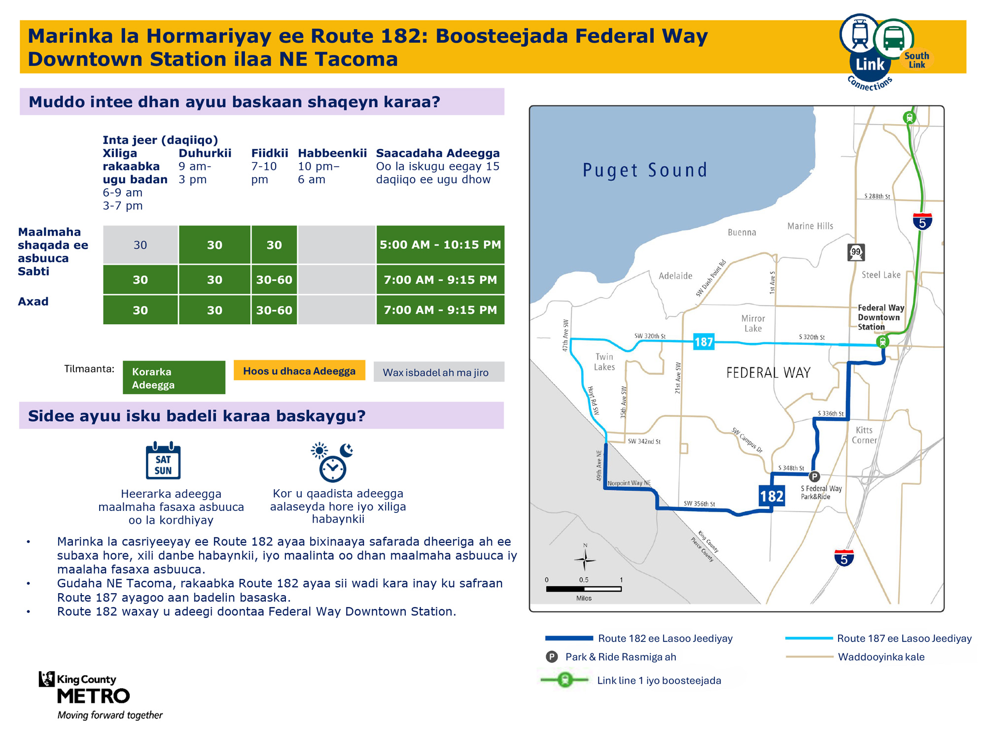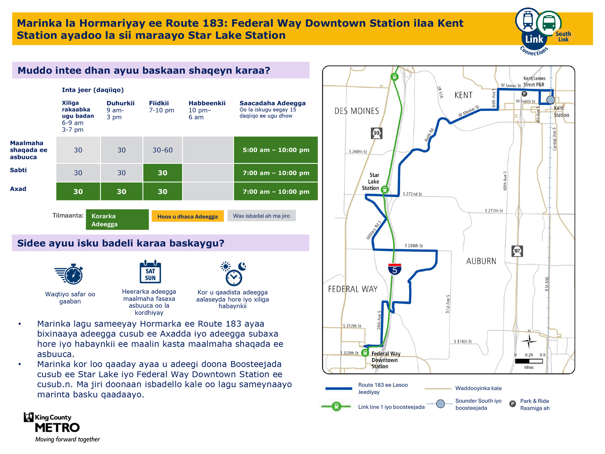 Waxaa lagu hormariyay safaro badan maalin kasta oo todobaadka ah. Waxay ku xiri doontaa tareenka fudud ee Link Federal Way Downtown Station.