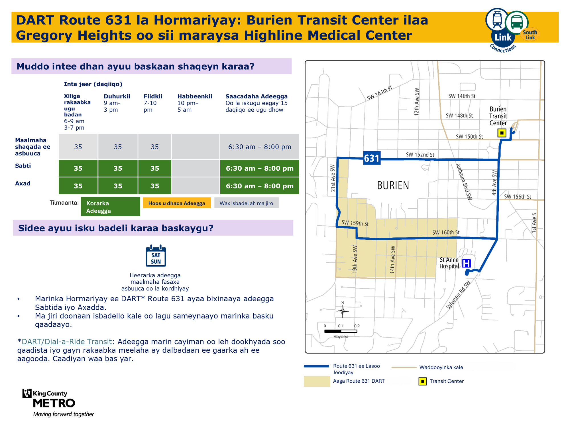 631 Waxay u adeegtaa Burien Burien Transit Center ilaa Gregory Heights oo sii maraysa Highline Medical Center.