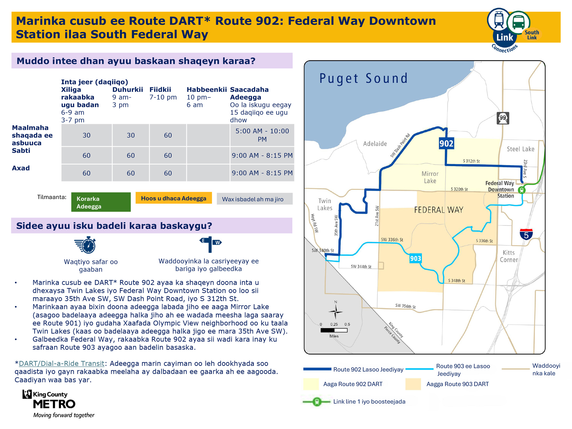 Wadada cusub ee DART. Waxay qeyb ahaan badalaysaa DART Route 901 oo leh safaro badan maalin kasta todobaadka. Waxay ku xiri doontaa tareenka fudud ee Link Federal Way Downtown Station.