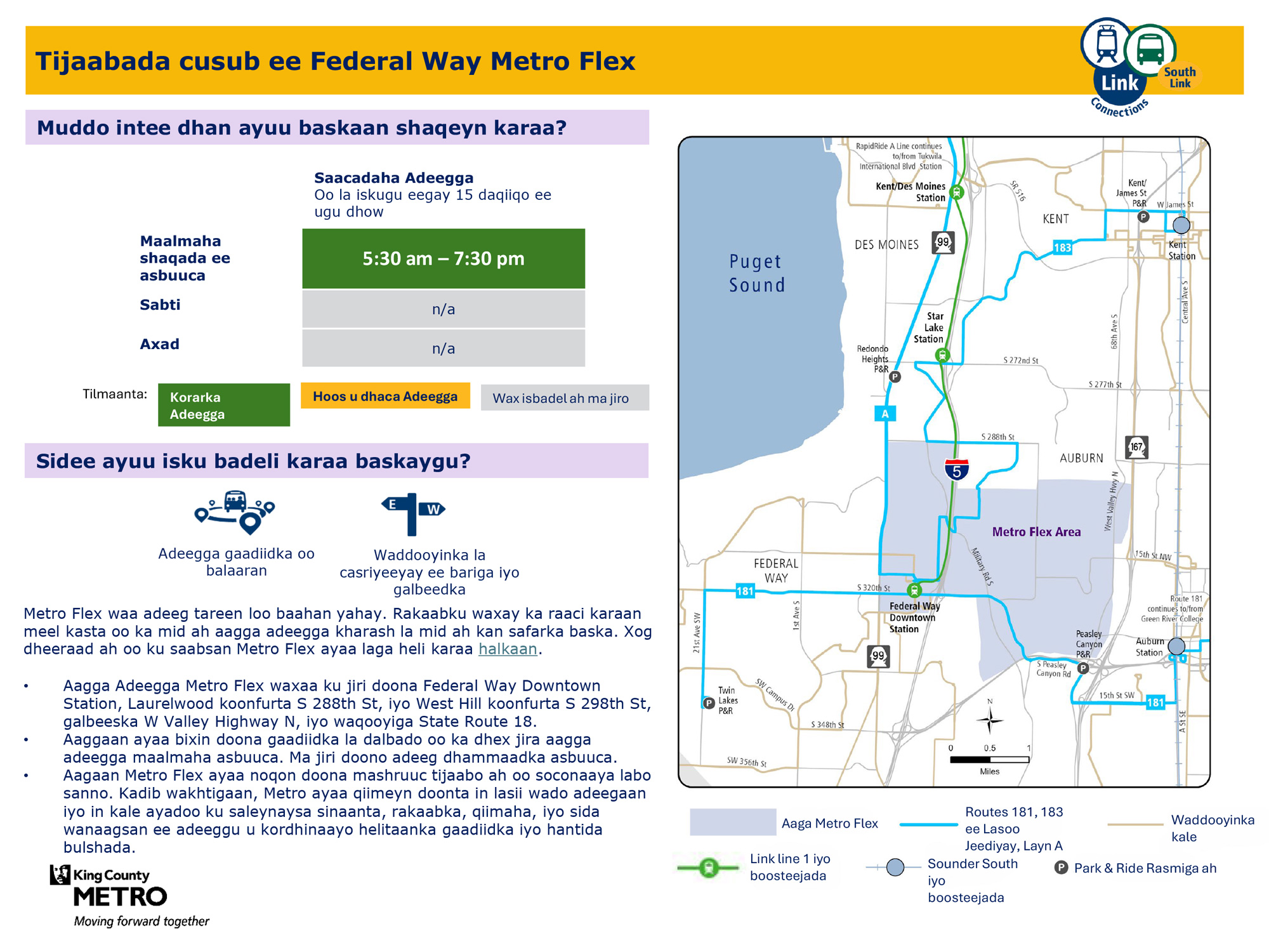 Tijaabada Federal Way Metro Flex Waxay u adeegtaa Federal Way, Auburn Goobta cusub ee Metro Flex ee tijaabada ah bixinta adeega la helo marka loo baahdo ee Isniinta ilaa Jimcaha. U adeega Federal Way Downtown Station, Laurelwood ee koonfurta S 288th St iyo West Hill ee koonfurta S 298th St, west of W Valley Highway N, iyo waqooyiga State Route 18.