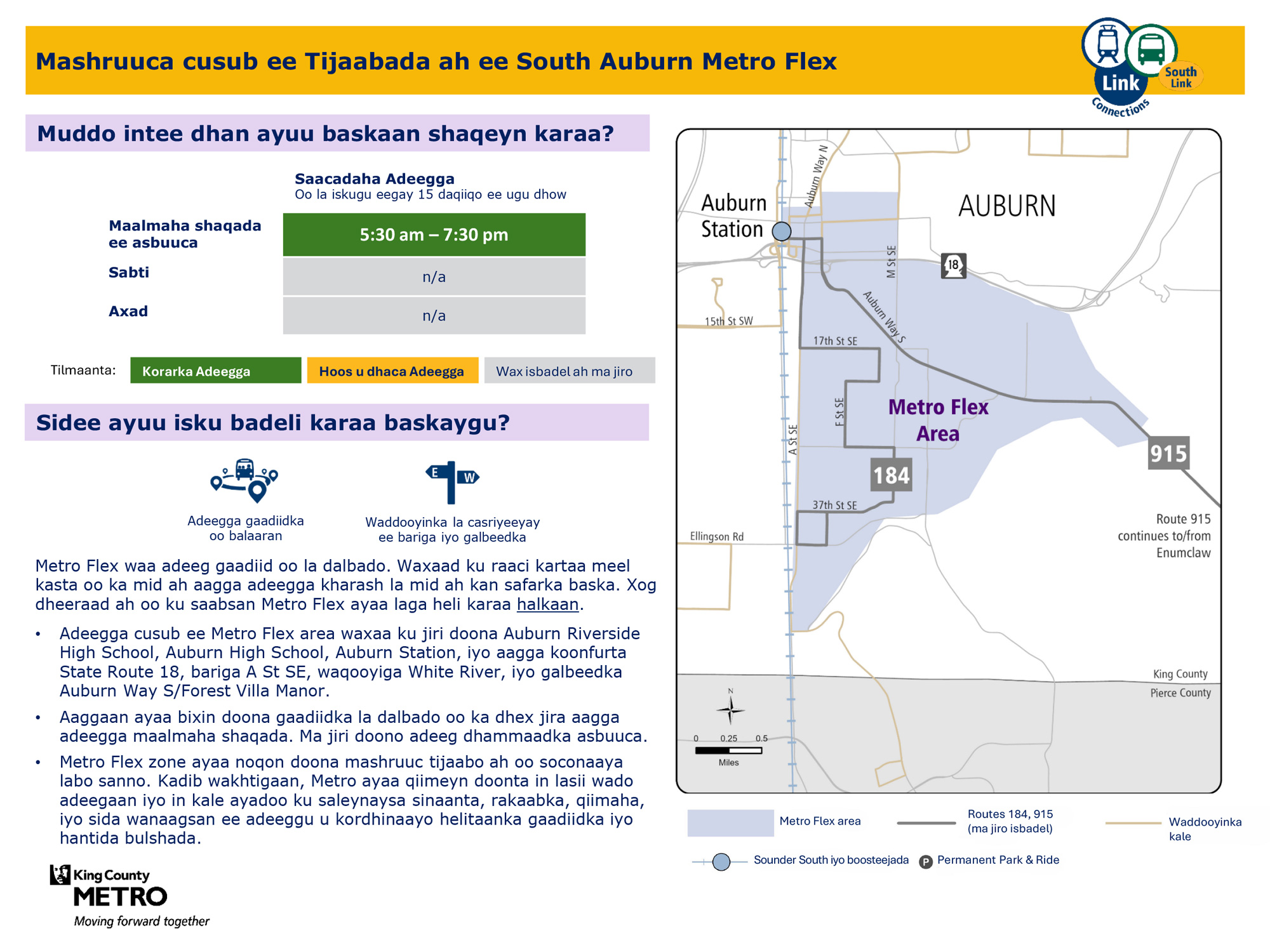 • Ikhtiyaarada cusub ee baahida loo qabo: Waxay soo bandhigaysaa laba mashruuc oo cusub Metro Flex marka la dalbado duuliye adeegyada gudaha Federal Way iyo Auburn.