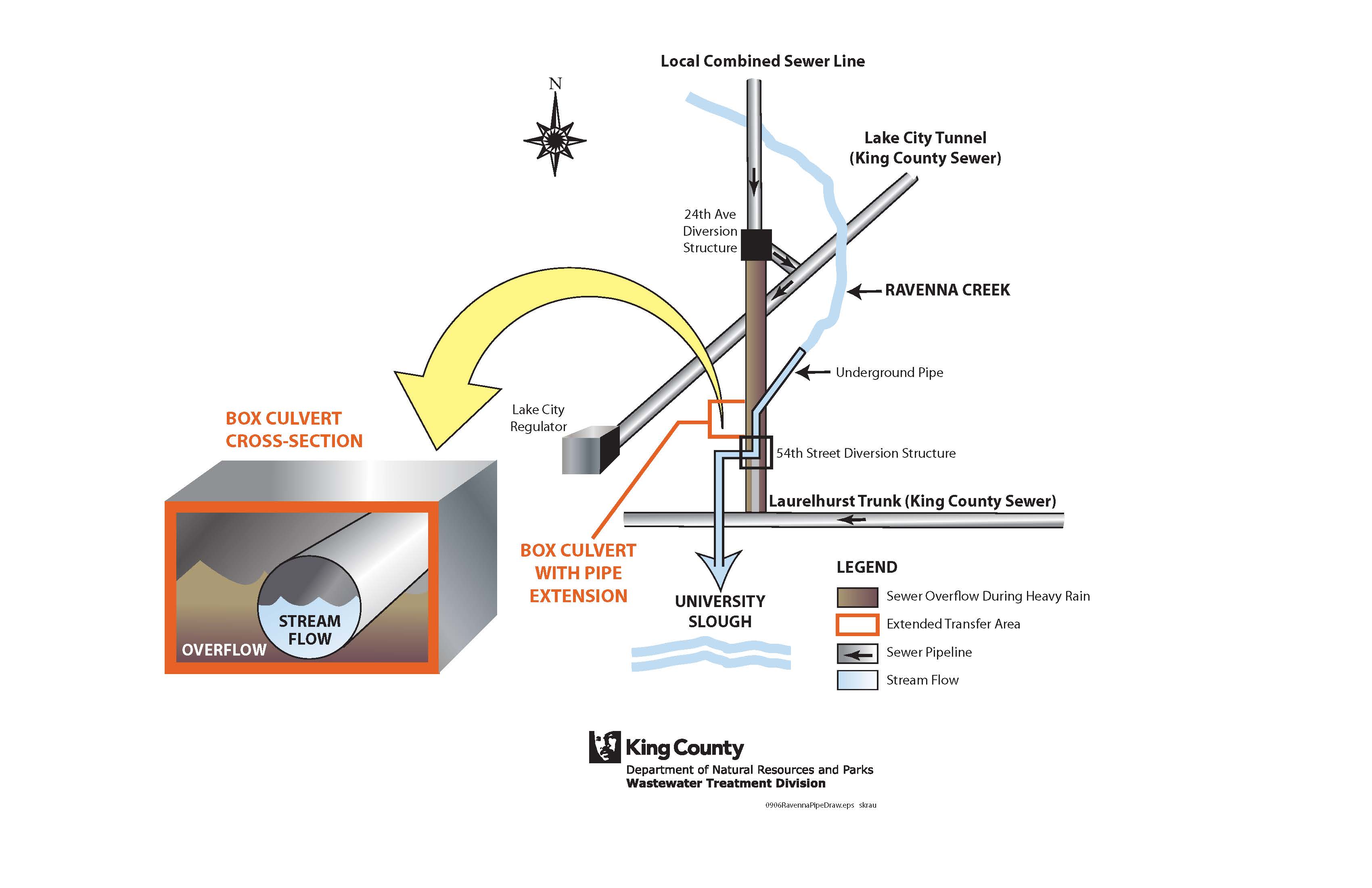 Phase B of the project took place during Summer 2010. This phase consisted of extending the pipeline that conveys Ravenna Creek downstream from Ravenna Park. A section of pipeline was added to isolate the stream and prevent potential sewer overflows into University Slough.