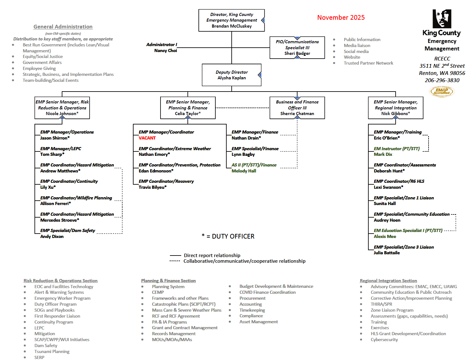 King County Emergency Management provides for the effective direction, control and coordination of County government services functional units; provides liaison with other governments and the private, non-governmental section; and, serve as the coordinating entity for cities, County departments, and other appropriate agencies, during incidents and events of regional significance. This is done in support of the Executive's Vision of King County as a welcoming place where everyone has the opportunity to thrive.
