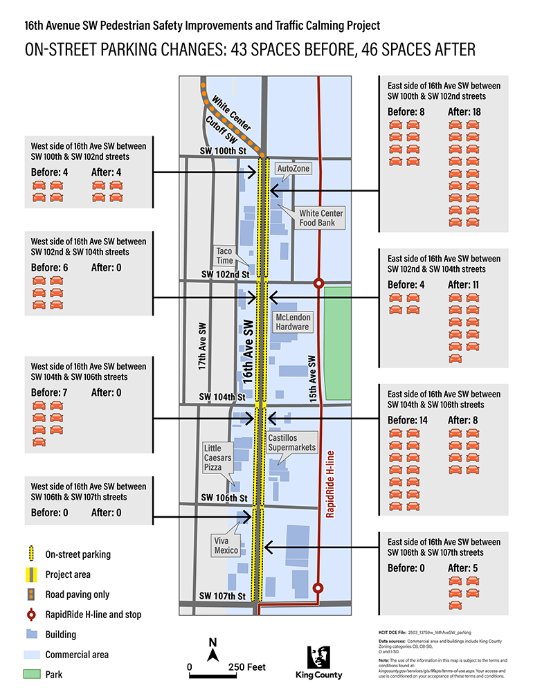 Currently, there are 43 parking spaces on 16th Avenue SW between SW 100th and SW 107th streets. The total number of parking spaces in the project area will increase to 46, but some will be in different places than before. For instance, some parking spaces that are currently located on the west side of the road will be moved to the east side. This shift is necessary to accommodate new bike lanes, sidewalk curb extensions, and safety improvements.