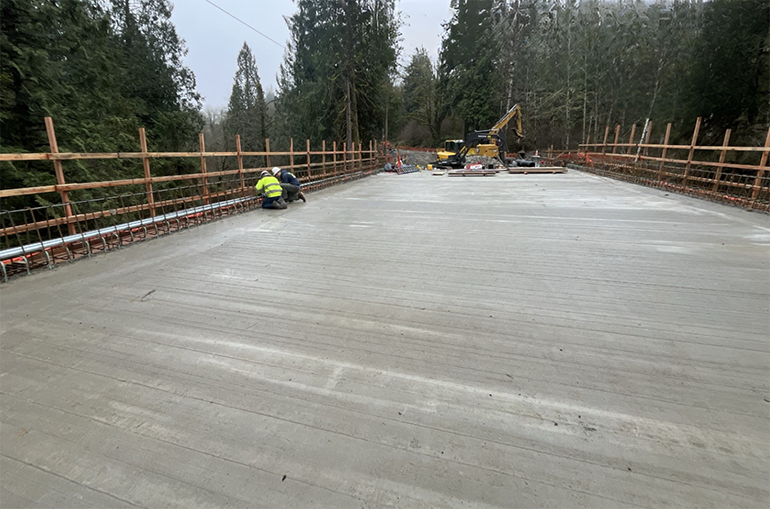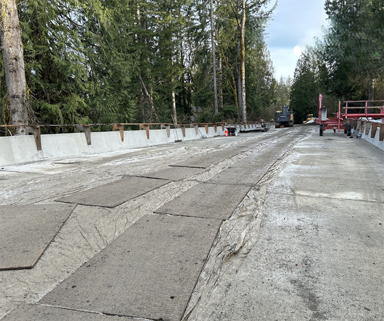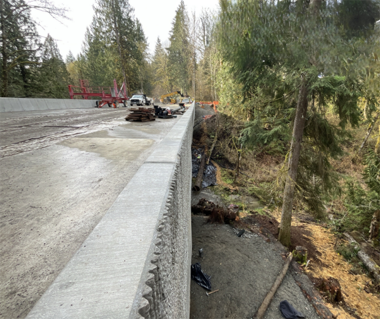 April 2025 – New pavement, lane markings and guardrail are now complete on Ames Lake-Carnation Rd NE approaching the north and south ends of the bridge.