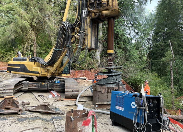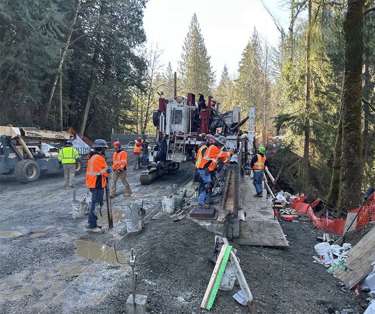 August 2024 – Crews use a giant drill to dig 75 feet deep in the earth. This is the first of three shafts that will be drilled on each side of the bridge.