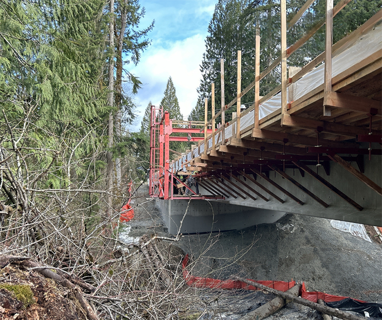 February 2025 - The red overhanging platform is called a stripping buggy. This equipment lets crews climb down and remove the remaining form work and bracing used to build the bridge deck.