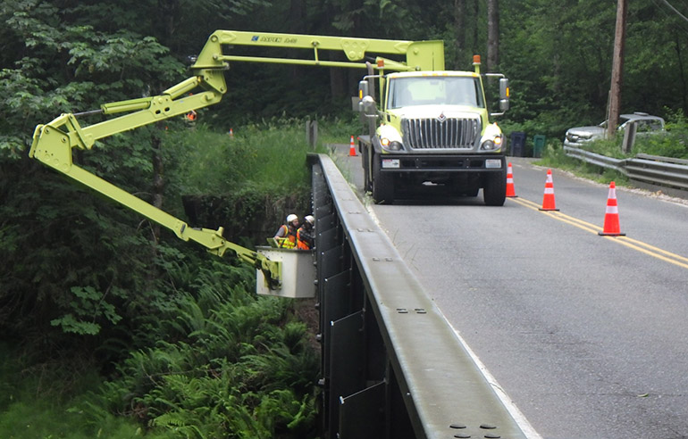 Two engineers inspect the Ames Lake Trestle Bridge from the bucket of an under-bridge-inspection-truck (UBIT) truck.