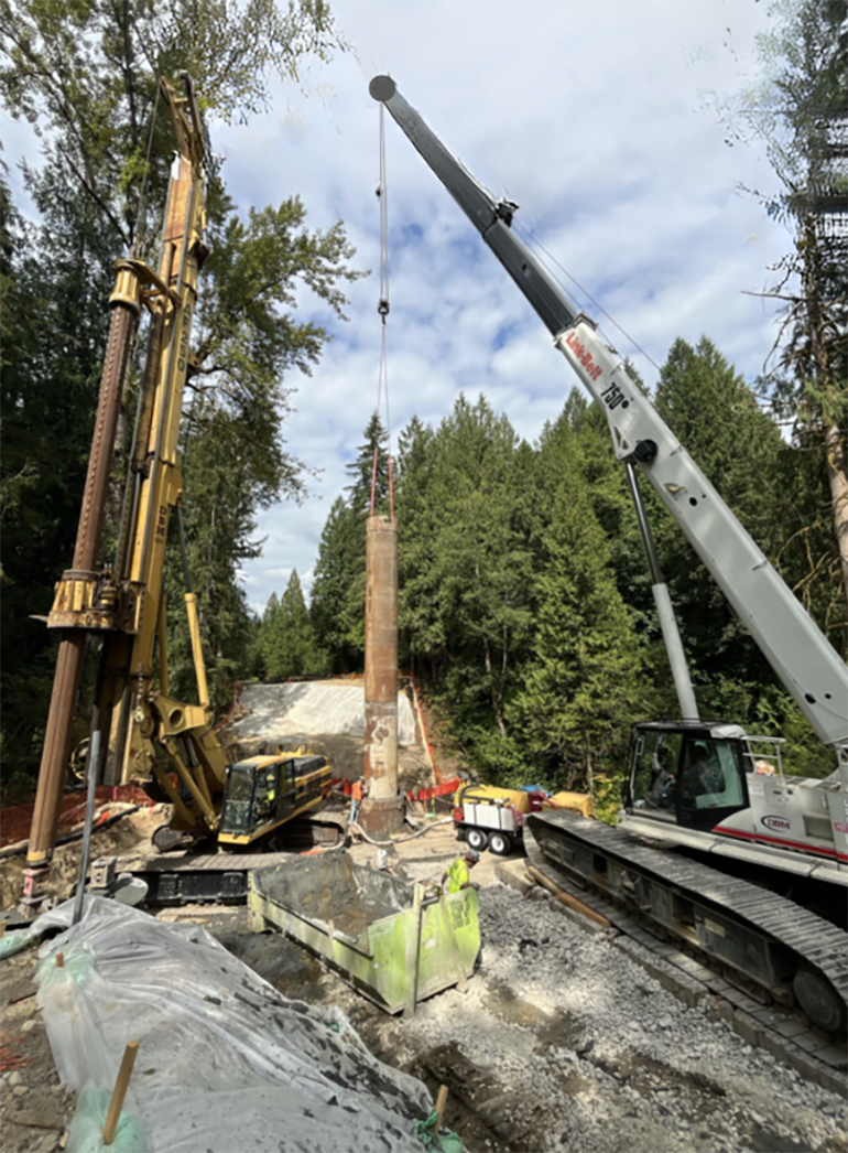 August 2024 – Large steel pipes, known as “telescoping casings,” are installed into the drilled shaft with a crane. These pipes help to prevent the deep soil from caving in after the opening has been drilled.
