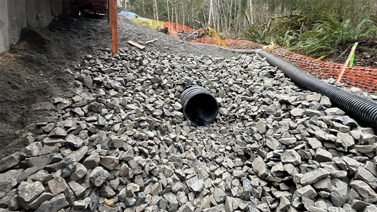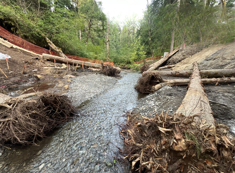 April 2025 – Plastic tarping was used for the duration of the project to protect Ames Creek from construction debris. The tarping is now removed and the rushing stream has been well-equipped with natural materials to promote a thriving ecosystem.