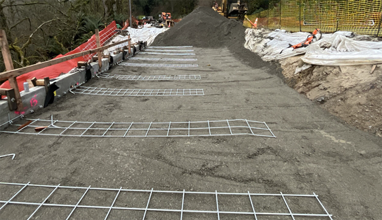 January 2025 – Work is done in small sections to maximize efficiency and progress of the bridge deck. Here, the subgrade material has been set and compacted, awaiting carpenters to place supportive wood forms across the bridge approach. Iron crews can then construct rebar layers to prepare this section of the structure for concrete placement.