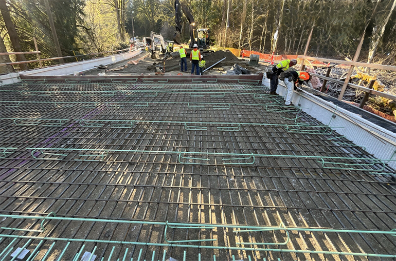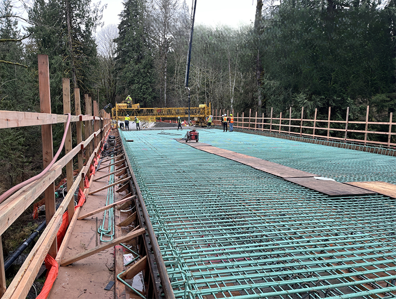 November 2024 - Temporary decking provides a safe surface for workers as they prepare to pour concrete for the bridge deck.