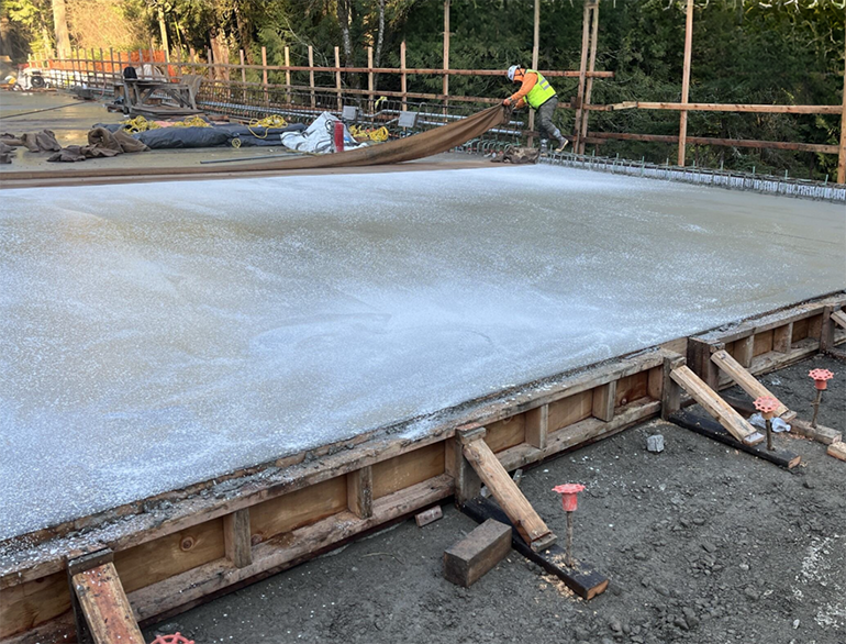 January 2025 – A white liquid curing compound is required to be placed on top of the wet concrete to help the concrete set in place.