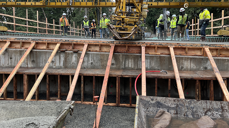 February 2025 - Crews are hard at work placing the concrete bridge barrier. The slipform machine on the left shapes the barrier, while team members smooth out the fresh concrete for a clean finish.