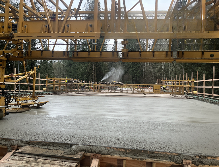 December 2024 – Freshly poured concrete is leveled by the concrete paving machine for a smooth finish. Once the concrete cures over the next several weeks, crews will apply additional surface treatments to create a durable roadway.