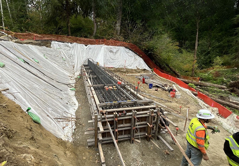 October 2024 – A crewmember inspects the foundation for the northern abutment wall, which is comprised of three buried 5-foot diameter concrete shafts that extend 60 feet into the ground. The deep structure is topped off with concrete, and crews will begin building up the abutment wall after the concrete cures.