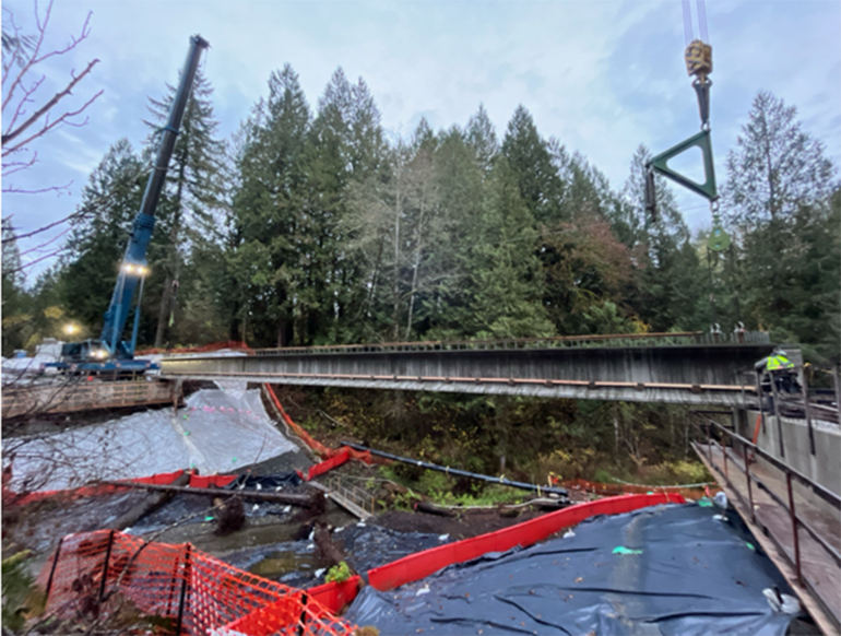 The Ames Lake Trestle Bridge was built 100 years ago and was originally designed with narrow lanes for much smaller vehicles compared with what we see on the road today. The previous bridge had a posted weight restriction for specific large trucks and specialized hauling vehicles. The new bridge provides a safer, unrestricted crossing for the community.