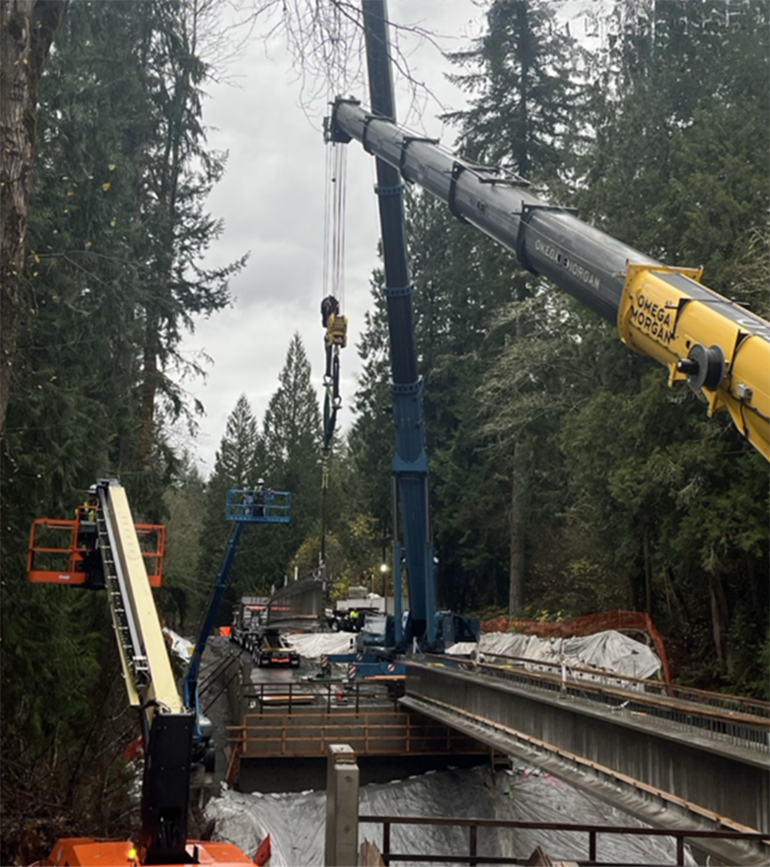 November 2024 – Girders are concrete beams that serve as the primary support for the bridge deck. Cranes are used to guide these girders into place over Ames Creek.