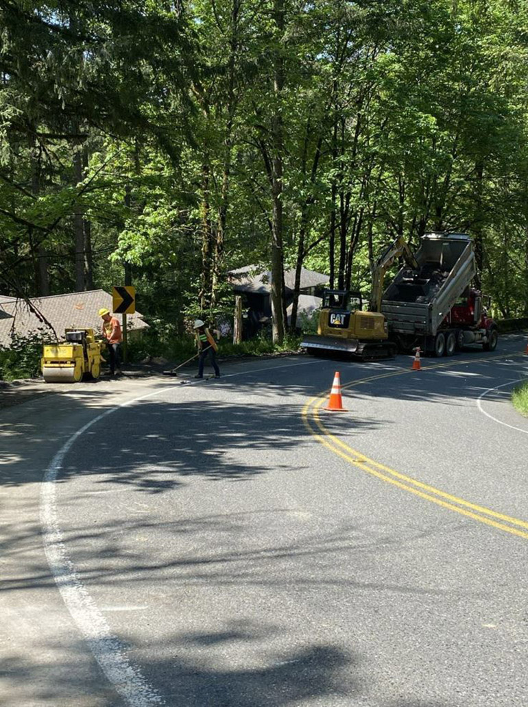May 25, 2023 – Crews prep this sharp curve on SE Mirrormont Boulevard & 245th Avenue SE between Issaquah-Hobart Road SE to SE 146th Street for new concrete barricades.