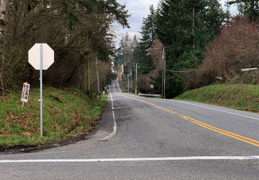 S 360th Street looking toward northbound Military Road S. This is a tricky intersection because Military Road S curves just to the south and S 360th Street comes in at an angle.