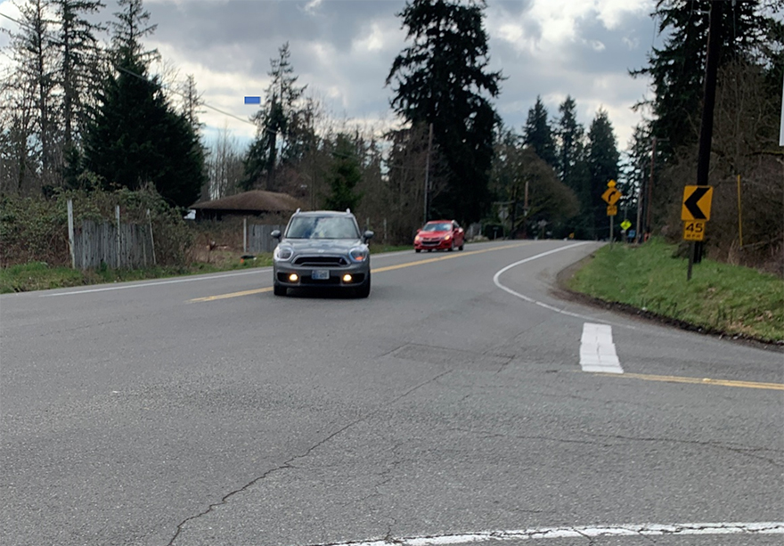 Military Road S looking south. This car is turning onto westbound S 360th Street. A stoplight here could lead to rear-end collisions on this busy arterial. Instead, a roundabout smooths and calms traffic so cars like this can safely turn and not worry about southbound traffic.